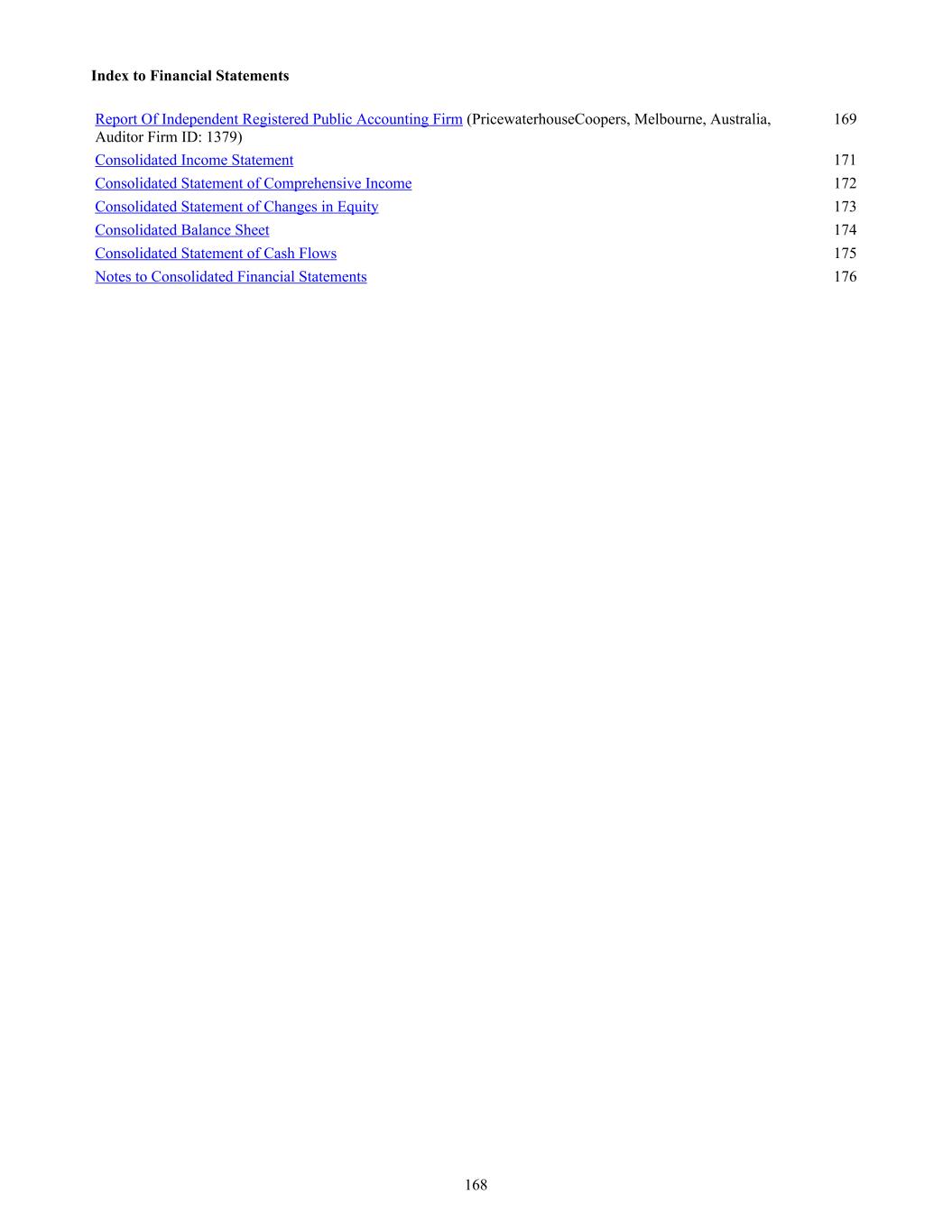 Index to Financial Statements Report Of Independent Registered Public Accounting Firm (PricewaterhouseCoopers, Melbourne, Australia, Auditor Firm ID: 1379) 169 Consolidated Income Statement 171 Consolidated Statement of Comprehensive Income 172 Consolidated Statement of Changes in Equity 173 Consolidated Balance Sheet 174 Consolidated Statement of Cash Flows 175 Notes to Consolidated Financial Statements 176 168