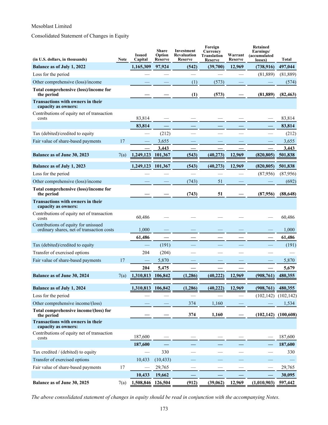 Mesoblast Limited Consolidated Statement of Changes in Equity (in U.S. dollars, in thousands) Note Issued Capital Share Option Reserve Investment Revaluation Reserve Foreign Currency Translation Reserve Warrant Reserve Retained Earnings/ (accumulated losses) Total Balance as of July 1, 2022 1,165,309 97,924 (542) (39,700) 12,969 (738,916) 497,044 Loss for the period — — — — — (81,889) (81,889) Other comprehensive (loss)/income — — (1) (573) — — (574) Total comprehensive (loss)/income for the period — — (1) (573) — (81,889) (82,463) Transactions with owners in their capacity as owners: Contributions of equity net of transaction costs 83,814 — — — — — 83,814 83,814 — — — — — 83,814 Tax (debited)/credited to equity — (212) — — — — (212) Fair value of share-based payments 17 — 3,655 — — — — 3,655 — 3,443 — — — — 3,443 Balance as of June 30, 2023 7(a) 1,249,123 101,367 (543) (40,273) 12,969 (820,805) 501,838 Balance as of July 1, 2023 1,249,123 101,367 (543) (40,273) 12,969 (820,805) 501,838 Loss for the period — — — — — (87,956) (87,956) Other comprehensive (loss)/income — — (743) 51 — — (692) Total comprehensive (loss)/income for the period — — (743) 51 — (87,956) (88,648) Transactions with owners in their capacity as owners: Contributions of equity net of transaction costs 60,486 — — — — — 60,486 Contributions of equity for unissued ordinary shares, net of transaction costs 1,000 — — — — — 1,000 61,486 — — — — — 61,486 Tax (debited)/credited to equity — (191) — — — — (191) Transfer of exercised options 204 (204) — — — — — Fair value of share-based payments 17 — 5,870 — — — — 5,870 204 5,475 — — — — 5,679 Balance as of June 30, 2024 7(a) 1,310,813 106,842 (1,286) (40,222) 12,969 (908,761) 480,355 Balance as of July 1, 2024 1,310,813 106,842 (1,286) (40,222) 12,969 (908,761) 480,355 Loss for the period — — — — — (102,142) (102,142) Other comprehensive income/(loss) — — 374 1,160 — — 1,534 Total comprehensive income/(loss) for the period — — 374 1,160 — (102,142) (100,608) Transactions with owners in their capacity as owners: Contributions of equity net of transaction costs 187,600 — — — — — 187,600 187,600 — — — — — 187,600 Tax credited / (debited) to equity — 330 — — — — 330 Transfer of exercised options 10,433 (10,433) — — — — — Fair value of share-based payments 17 — 29,765 — — — — 29,765 10,433 19,662 — — — — 30,095 Balance as of June 30, 2025 7(a) 1,508,846 126,504 (912) (39,062) 12,969 (1,010,903) 597,442 The above consolidated statement of changes in equity should be read in conjunction with the accompanying Notes. 173
