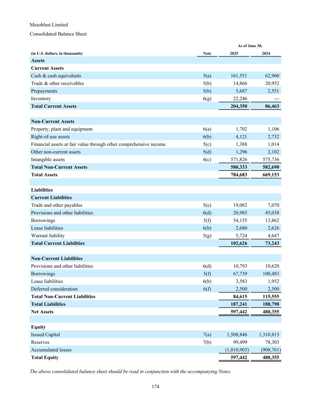 Mesoblast Limited Consolidated Balance Sheet As of June 30, (in U.S. dollars, in thousands) Note 2025 2024 Assets Current Assets Cash & cash equivalents 5(a) 161,551 62,960 Trade & other receivables 5(b) 14,866 20,952 Prepayments 5(b) 5,687 2,551 Inventory 6(g) 22,246 — Total Current Assets 204,350 86,463 Non-Current Assets Property, plant and equipment 6(a) 1,702 1,106 Right-of-use assets 6(b) 4,121 2,732 Financial assets at fair value through other comprehensive income 5(c) 1,388 1,014 Other non-current assets 5(d) 1,296 2,102 Intangible assets 6(c) 571,826 575,736 Total Non-Current Assets 580,333 582,690 Total Assets 784,683 669,153 Liabilities Current Liabilities Trade and other payables 5(e) 19,082 7,070 Provisions and other liabilities 6(d) 20,985 45,038 Borrowings 5(f) 54,155 13,862 Lease liabilities 6(b) 2,680 2,626 Warrant liability 5(g) 5,724 4,647 Total Current Liabilities 102,626 73,243 Non-Current Liabilities Provisions and other liabilities 6(d) 10,793 10,620 Borrowings 5(f) 67,739 100,483 Lease liabilities 6(b) 3,583 1,952 Deferred consideration 6(f) 2,500 2,500 Total Non-Current Liabilities 84,615 115,555 Total Liabilities 187,241 188,798 Net Assets 597,442 480,355 Equity Issued Capital 7(a) 1,508,846 1,310,813 Reserves 7(b) 99,499 78,303 Accumulated losses (1,010,903) (908,761) Total Equity 597,442 480,355 The above consolidated balance sheet should be read in conjunction with the accompanying Notes. 174