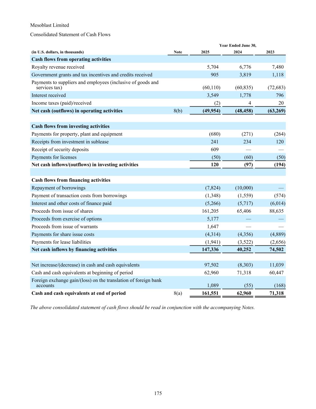 Mesoblast Limited Consolidated Statement of Cash Flows Year Ended June 30, (in U.S. dollars, in thousands) Note 2025 2024 2023 Cash flows from operating activities Royalty revenue received 5,704 6,776 7,480 Government grants and tax incentives and credits received 905 3,819 1,118 Payments to suppliers and employees (inclusive of goods and services tax) (60,110) (60,835) (72,683) Interest received 3,549 1,778 796 Income taxes (paid)/received (2) 4 20 Net cash (outflows) in operating activities 8(b) (49,954) (48,458) (63,269) Cash flows from investing activities Payments for property, plant and equipment (680) (271) (264) Receipts from investment in sublease 241 234 120 Receipt of security deposits 609 — — Payments for licenses (50) (60) (50) Net cash inflows/(outflows) in investing activities 120 (97) (194) Cash flows from financing activities Repayment of borrowings (7,824) (10,000) — Payment of transaction costs from borrowings (1,348) (1,559) (574) Interest and other costs of finance paid (5,266) (5,717) (6,014) Proceeds from issue of shares 161,205 65,406 88,635 Proceeds from exercise of options 5,177 — — Proceeds from issue of warrants 1,647 — — Payments for share issue costs (4,314) (4,356) (4,889) Payments for lease liabilities (1,941) (3,522) (2,656) Net cash inflows by financing activities 147,336 40,252 74,502 Net increase/(decrease) in cash and cash equivalents 97,502 (8,303) 11,039 Cash and cash equivalents at beginning of period 62,960 71,318 60,447 Foreign exchange gain/(loss) on the translation of foreign bank accounts 1,089 (55) (168) Cash and cash equivalents at end of period 8(a) 161,551 62,960 71,318 The above consolidated statement of cash flows should be read in conjunction with the accompanying Notes. 175