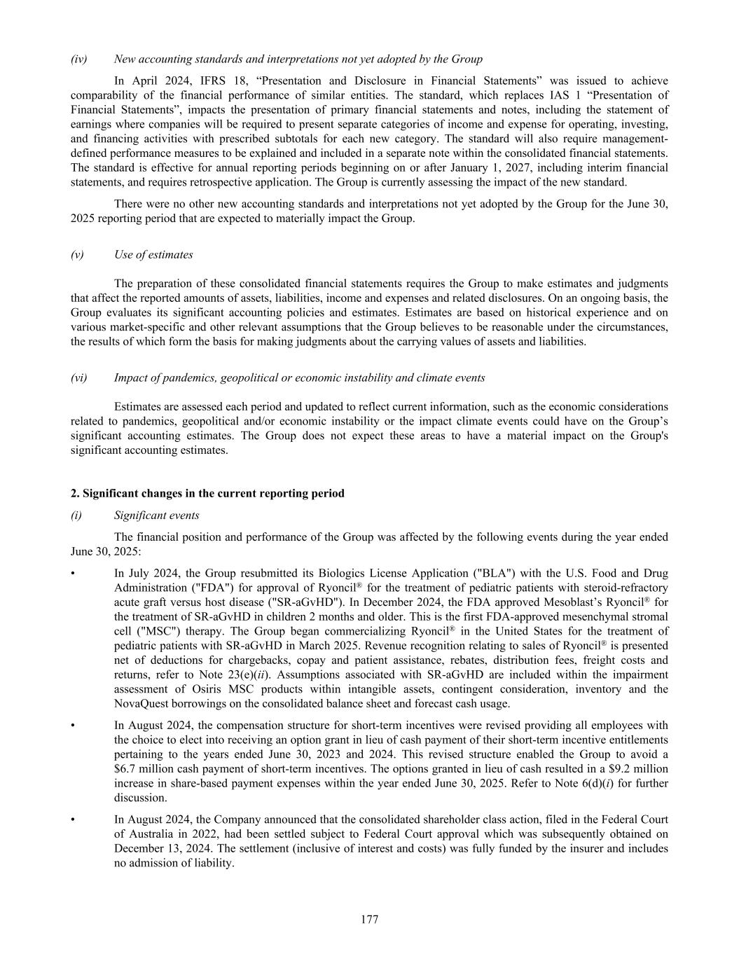 (iv) New accounting standards and interpretations not yet adopted by the Group In April 2024, IFRS 18, “Presentation and Disclosure in Financial Statements” was issued to achieve comparability of the financial performance of similar entities. The standard, which replaces IAS 1 “Presentation of Financial Statements”, impacts the presentation of primary financial statements and notes, including the statement of earnings where companies will be required to present separate categories of income and expense for operating, investing, and financing activities with prescribed subtotals for each new category. The standard will also require management- defined performance measures to be explained and included in a separate note within the consolidated financial statements. The standard is effective for annual reporting periods beginning on or after January 1, 2027, including interim financial statements, and requires retrospective application. The Group is currently assessing the impact of the new standard. There were no other new accounting standards and interpretations not yet adopted by the Group for the June 30, 2025 reporting period that are expected to materially impact the Group. (v) Use of estimates The preparation of these consolidated financial statements requires the Group to make estimates and judgments that affect the reported amounts of assets, liabilities, income and expenses and related disclosures. On an ongoing basis, the Group evaluates its significant accounting policies and estimates. Estimates are based on historical experience and on various market-specific and other relevant assumptions that the Group believes to be reasonable under the circumstances, the results of which form the basis for making judgments about the carrying values of assets and liabilities. (vi) Impact of pandemics, geopolitical or economic instability and climate events Estimates are assessed each period and updated to reflect current information, such as the economic considerations related to pandemics, geopolitical and/or economic instability or the impact climate events could have on the Group’s significant accounting estimates. The Group does not expect these areas to have a material impact on the Group's significant accounting estimates. 2. Significant changes in the current reporting period (i) Significant events The financial position and performance of the Group was affected by the following events during the year ended June 30, 2025: • In July 2024, the Group resubmitted its Biologics License Application ("BLA") with the U.S. Food and Drug Administration ("FDA") for approval of Ryoncil® for the treatment of pediatric patients with steroid-refractory acute graft versus host disease ("SR-aGvHD"). In December 2024, the FDA approved Mesoblast’s Ryoncil® for the treatment of SR-aGvHD in children 2 months and older. This is the first FDA-approved mesenchymal stromal cell ("MSC") therapy. The Group began commercializing Ryoncil® in the United States for the treatment of pediatric patients with SR-aGvHD in March 2025. Revenue recognition relating to sales of Ryoncil® is presented net of deductions for chargebacks, copay and patient assistance, rebates, distribution fees, freight costs and returns, refer to Note 23(e)(ii). Assumptions associated with SR-aGvHD are included within the impairment assessment of Osiris MSC products within intangible assets, contingent consideration, inventory and the NovaQuest borrowings on the consolidated balance sheet and forecast cash usage. • In August 2024, the compensation structure for short-term incentives were revised providing all employees with the choice to elect into receiving an option grant in lieu of cash payment of their short-term incentive entitlements pertaining to the years ended June 30, 2023 and 2024. This revised structure enabled the Group to avoid a $6.7 million cash payment of short-term incentives. The options granted in lieu of cash resulted in a $9.2 million increase in share-based payment expenses within the year ended June 30, 2025. Refer to Note 6(d)(i) for further discussion. • In August 2024, the Company announced that the consolidated shareholder class action, filed in the Federal Court of Australia in 2022, had been settled subject to Federal Court approval which was subsequently obtained on December 13, 2024. The settlement (inclusive of interest and costs) was fully funded by the insurer and includes no admission of liability. 177