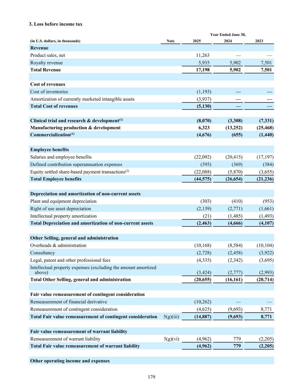 3. Loss before income tax Revenue Product sales, net 11,263 — — Royalty revenue 5,935 5,902 7,501 Total Revenue 17,198 5,902 7,501 Cost of revenues Cost of inventories (1,193) — — Amortization of currently marketed intangible assets (3,937) — — Total Cost of revenues (5,130) — — Clinical trial and research & development(1) (8,070) (3,308) (7,331) Manufacturing production & development 6,323 (13,252) (25,468) Commercialization(1) (4,676) (655) (1,440) Employee benefits Salaries and employee benefits (22,092) (20,415) (17,197) Defined contribution superannuation expenses (395) (369) (384) Equity settled share-based payment transactions(2) (22,088) (5,870) (3,655) Total Employee benefits (44,575) (26,654) (21,236) Depreciation and amortization of non-current assets Plant and equipment depreciation (303) (410) (953) Right of use asset depreciation (2,139) (2,771) (1,661) Intellectual property amortization (21) (1,485) (1,493) Total Depreciation and amortization of non-current assets (2,463) (4,666) (4,107) Other Selling, general and administration Overheads & administration (10,168) (8,584) (10,104) Consultancy (2,728) (2,458) (3,922) Legal, patent and other professional fees (4,335) (2,342) (3,695) Intellectual property expenses (excluding the amount amortized above) (3,424) (2,777) (2,993) Total Other Selling, general and administration (20,655) (16,161) (20,714) Fair value remeasurement of contingent consideration Remeasurement of financial derivative (10,262) — — Remeasurement of contingent consideration (4,625) (9,693) 8,771 Total Fair value remeasurement of contingent consideration 5(g)(iii) (14,887) (9,693) 8,771 Fair value remeasurement of warrant liability Remeasurement of warrant liability 5(g)(vi) (4,962) 779 (2,205) Total Fair value remeasurement of warrant liability (4,962) 779 (2,205) Other operating income and expenses Year Ended June 30, (in U.S. dollars, in thousands) Note 2025 2024 2023 179