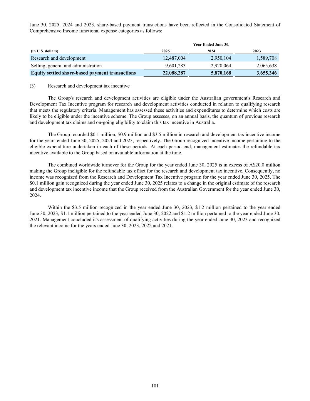 June 30, 2025, 2024 and 2023, share-based payment transactions have been reflected in the Consolidated Statement of Comprehensive Income functional expense categories as follows: Year Ended June 30, (in U.S. dollars) 2025 2024 2023 Research and development 12,487,004 2,950,104 1,589,708 Selling, general and administration 9,601,283 2,920,064 2,065,638 Equity settled share-based payment transactions 22,088,287 5,870,168 3,655,346 (3) Research and development tax incentive The Group's research and development activities are eligible under the Australian government's Research and Development Tax Incentive program for research and development activities conducted in relation to qualifying research that meets the regulatory criteria. Management has assessed these activities and expenditures to determine which costs are likely to be eligible under the incentive scheme. The Group assesses, on an annual basis, the quantum of previous research and development tax claims and on-going eligibility to claim this tax incentive in Australia. The Group recorded $0.1 million, $0.9 million and $3.5 million in research and development tax incentive income for the years ended June 30, 2025, 2024 and 2023, respectively. The Group recognized incentive income pertaining to the eligible expenditure undertaken in each of these periods. At each period end, management estimates the refundable tax incentive available to the Group based on available information at the time. The combined worldwide turnover for the Group for the year ended June 30, 2025 is in excess of A$20.0 million making the Group ineligible for the refundable tax offset for the research and development tax incentive. Consequently, no income was recognized from the Research and Development Tax Incentive program for the year ended June 30, 2025. The $0.1 million gain recognized during the year ended June 30, 2025 relates to a change in the original estimate of the research and development tax incentive income that the Group received from the Australian Government for the year ended June 30, 2024. Within the $3.5 million recognized in the year ended June 30, 2023, $1.2 million pertained to the year ended June 30, 2023, $1.1 million pertained to the year ended June 30, 2022 and $1.2 million pertained to the year ended June 30, 2021. Management concluded it's assessment of qualifying activities during the year ended June 30, 2023 and recognized the relevant income for the years ended June 30, 2023, 2022 and 2021. 181