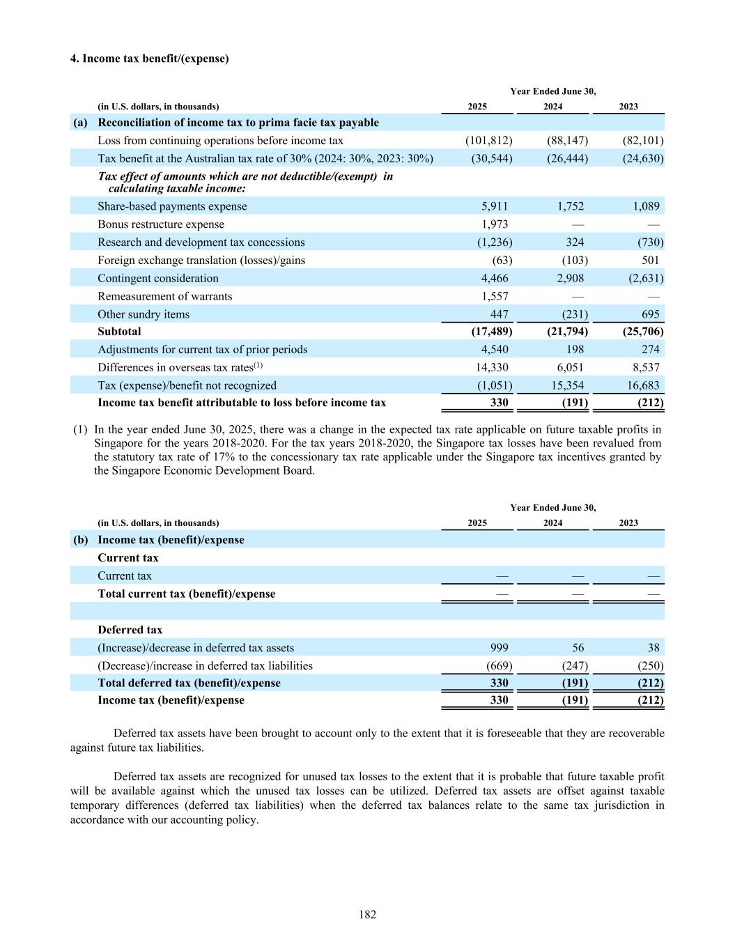 4. Income tax benefit/(expense) Year Ended June 30, (in U.S. dollars, in thousands) 2025 2024 2023 (a) Reconciliation of income tax to prima facie tax payable Loss from continuing operations before income tax (101,812) (88,147) (82,101) Tax benefit at the Australian tax rate of 30% (2024: 30%, 2023: 30%) (30,544) (26,444) (24,630) Tax effect of amounts which are not deductible/(exempt) in calculating taxable income: Share-based payments expense 5,911 1,752 1,089 Bonus restructure expense 1,973 — — Research and development tax concessions (1,236) 324 (730) Foreign exchange translation (losses)/gains (63) (103) 501 Contingent consideration 4,466 2,908 (2,631) Remeasurement of warrants 1,557 — — Other sundry items 447 (231) 695 Subtotal (17,489) (21,794) (25,706) Adjustments for current tax of prior periods 4,540 198 274 Differences in overseas tax rates(1) 14,330 6,051 8,537 Tax (expense)/benefit not recognized (1,051) 15,354 16,683 Income tax benefit attributable to loss before income tax 330 (191) (212) (1) In the year ended June 30, 2025, there was a change in the expected tax rate applicable on future taxable profits in Singapore for the years 2018-2020. For the tax years 2018-2020, the Singapore tax losses have been revalued from the statutory tax rate of 17% to the concessionary tax rate applicable under the Singapore tax incentives granted by the Singapore Economic Development Board. Year Ended June 30, (in U.S. dollars, in thousands) 2025 2024 2023 (b) Income tax (benefit)/expense Current tax Current tax — — — Total current tax (benefit)/expense — — — Deferred tax (Increase)/decrease in deferred tax assets 999 56 38 (Decrease)/increase in deferred tax liabilities (669) (247) (250) Total deferred tax (benefit)/expense 330 (191) (212) Income tax (benefit)/expense 330 (191) (212) Deferred tax assets have been brought to account only to the extent that it is foreseeable that they are recoverable against future tax liabilities. Deferred tax assets are recognized for unused tax losses to the extent that it is probable that future taxable profit will be available against which the unused tax losses can be utilized. Deferred tax assets are offset against taxable temporary differences (deferred tax liabilities) when the deferred tax balances relate to the same tax jurisdiction in accordance with our accounting policy. 182