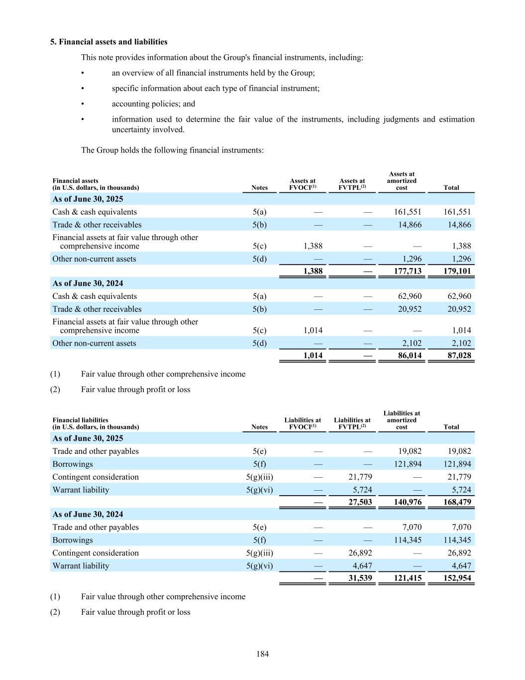 5. Financial assets and liabilities This note provides information about the Group's financial instruments, including: • an overview of all financial instruments held by the Group; • specific information about each type of financial instrument; • accounting policies; and • information used to determine the fair value of the instruments, including judgments and estimation uncertainty involved. The Group holds the following financial instruments: Financial assets (in U.S. dollars, in thousands) Notes Assets at FVOCI(1) Assets at FVTPL(2) Assets at amortized cost Total As of June 30, 2025 Cash & cash equivalents 5(a) — — 161,551 161,551 Trade & other receivables 5(b) — — 14,866 14,866 Financial assets at fair value through other comprehensive income 5(c) 1,388 — — 1,388 Other non-current assets 5(d) — — 1,296 1,296 1,388 — 177,713 179,101 As of June 30, 2024 Cash & cash equivalents 5(a) — — 62,960 62,960 Trade & other receivables 5(b) — — 20,952 20,952 Financial assets at fair value through other comprehensive income 5(c) 1,014 — — 1,014 Other non-current assets 5(d) — — 2,102 2,102 1,014 — 86,014 87,028 (1) Fair value through other comprehensive income (2) Fair value through profit or loss Financial liabilities (in U.S. dollars, in thousands) Notes Liabilities at FVOCI(1) Liabilities at FVTPL(2) Liabilities at amortized cost Total As of June 30, 2025 Trade and other payables 5(e) — — 19,082 19,082 Borrowings 5(f) — — 121,894 121,894 Contingent consideration 5(g)(iii) — 21,779 — 21,779 Warrant liability 5(g)(vi) — 5,724 — 5,724 — 27,503 140,976 168,479 As of June 30, 2024 Trade and other payables 5(e) — — 7,070 7,070 Borrowings 5(f) — — 114,345 114,345 Contingent consideration 5(g)(iii) — 26,892 — 26,892 Warrant liability 5(g)(vi) — 4,647 — 4,647 — 31,539 121,415 152,954 (1) Fair value through other comprehensive income (2) Fair value through profit or loss 184