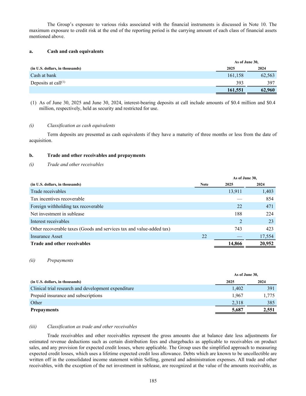 The Group’s exposure to various risks associated with the financial instruments is discussed in Note 10. The maximum exposure to credit risk at the end of the reporting period is the carrying amount of each class of financial assets mentioned above. a. Cash and cash equivalents As of June 30, (in U.S. dollars, in thousands) 2025 2024 Cash at bank 161,158 62,563 Deposits at call(1) 393 397 161,551 62,960 (1) As of June 30, 2025 and June 30, 2024, interest-bearing deposits at call include amounts of $0.4 million and $0.4 million, respectively, held as security and restricted for use. (i) Classification as cash equivalents Term deposits are presented as cash equivalents if they have a maturity of three months or less from the date of acquisition. b. Trade and other receivables and prepayments (i) Trade and other receivables As of June 30, (in U.S. dollars, in thousands) Note 2025 2024 Trade receivables 13,911 1,403 Tax incentives recoverable — 854 Foreign withholding tax recoverable 22 471 Net investment in sublease 188 224 Interest receivables 2 23 Other recoverable taxes (Goods and services tax and value-added tax) 743 423 Insurance Asset 22 — 17,554 Trade and other receivables 14,866 20,952 (ii) Prepayments As of June 30, (in U.S. dollars, in thousands) 2025 2024 Clinical trial research and development expenditure 1,402 391 Prepaid insurance and subscriptions 1,967 1,775 Other 2,318 385 Prepayments 5,687 2,551 (iii) Classification as trade and other receivables Trade receivables and other receivables represent the gross amounts due at balance date less adjustments for estimated revenue deductions such as certain distribution fees and chargebacks as applicable to receivables on product sales, and any provision for expected credit losses, where applicable. The Group uses the simplified approach to measuring expected credit losses, which uses a lifetime expected credit loss allowance. Debts which are known to be uncollectible are written off in the consolidated income statement within Selling, general and administration expenses. All trade and other receivables, with the exception of the net investment in sublease, are recognized at the value of the amounts receivable, as 185
