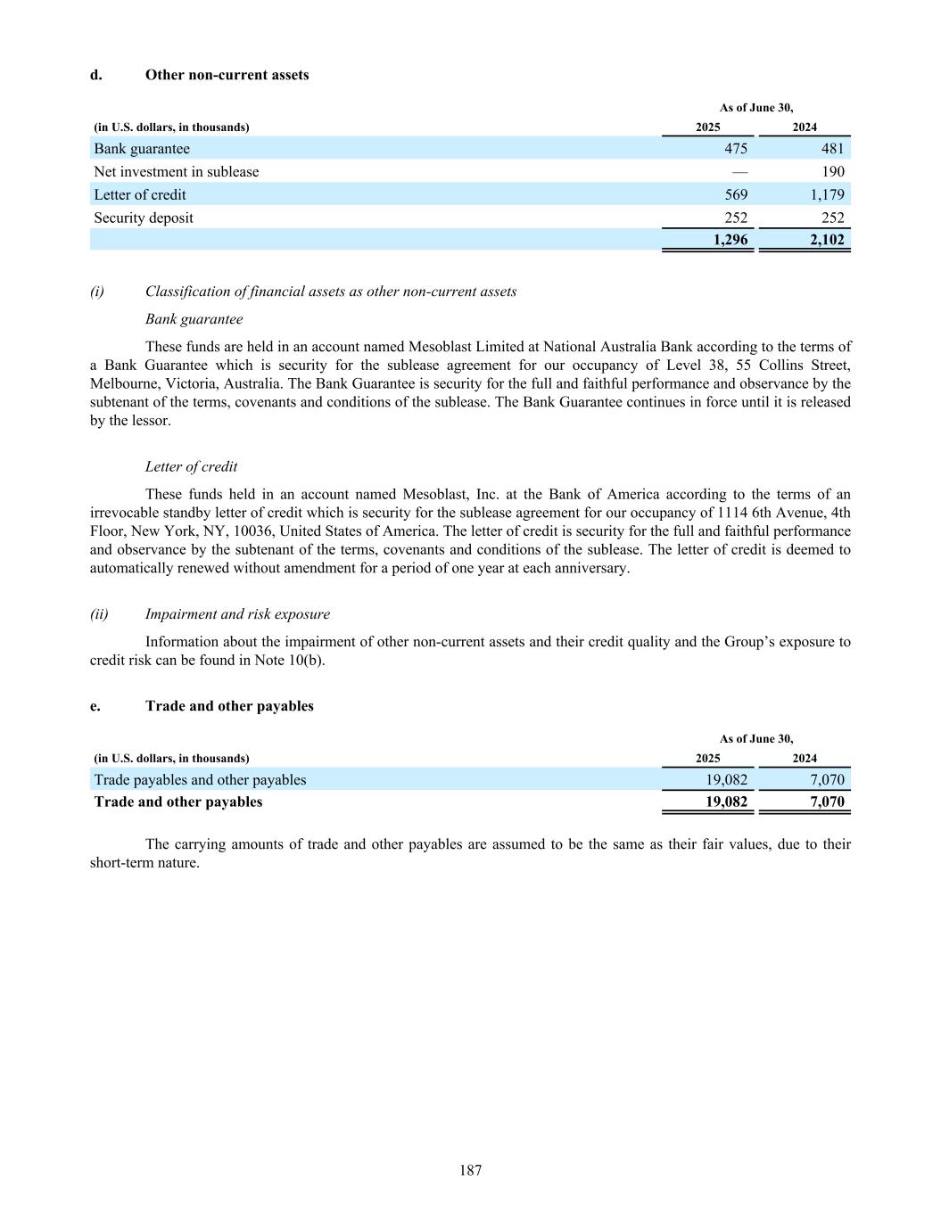 d. Other non-current assets As of June 30, (in U.S. dollars, in thousands) 2025 2024 Bank guarantee 475 481 Net investment in sublease — 190 Letter of credit 569 1,179 Security deposit 252 252 1,296 2,102 (i) Classification of financial assets as other non-current assets Bank guarantee These funds are held in an account named Mesoblast Limited at National Australia Bank according to the terms of a Bank Guarantee which is security for the sublease agreement for our occupancy of Level 38, 55 Collins Street, Melbourne, Victoria, Australia. The Bank Guarantee is security for the full and faithful performance and observance by the subtenant of the terms, covenants and conditions of the sublease. The Bank Guarantee continues in force until it is released by the lessor. Letter of credit These funds held in an account named Mesoblast, Inc. at the Bank of America according to the terms of an irrevocable standby letter of credit which is security for the sublease agreement for our occupancy of 1114 6th Avenue, 4th Floor, New York, NY, 10036, United States of America. The letter of credit is security for the full and faithful performance and observance by the subtenant of the terms, covenants and conditions of the sublease. The letter of credit is deemed to automatically renewed without amendment for a period of one year at each anniversary. (ii) Impairment and risk exposure Information about the impairment of other non-current assets and their credit quality and the Group’s exposure to credit risk can be found in Note 10(b). e. Trade and other payables As of June 30, (in U.S. dollars, in thousands) 2025 2024 Trade payables and other payables 19,082 7,070 Trade and other payables 19,082 7,070 The carrying amounts of trade and other payables are assumed to be the same as their fair values, due to their short-term nature. 187