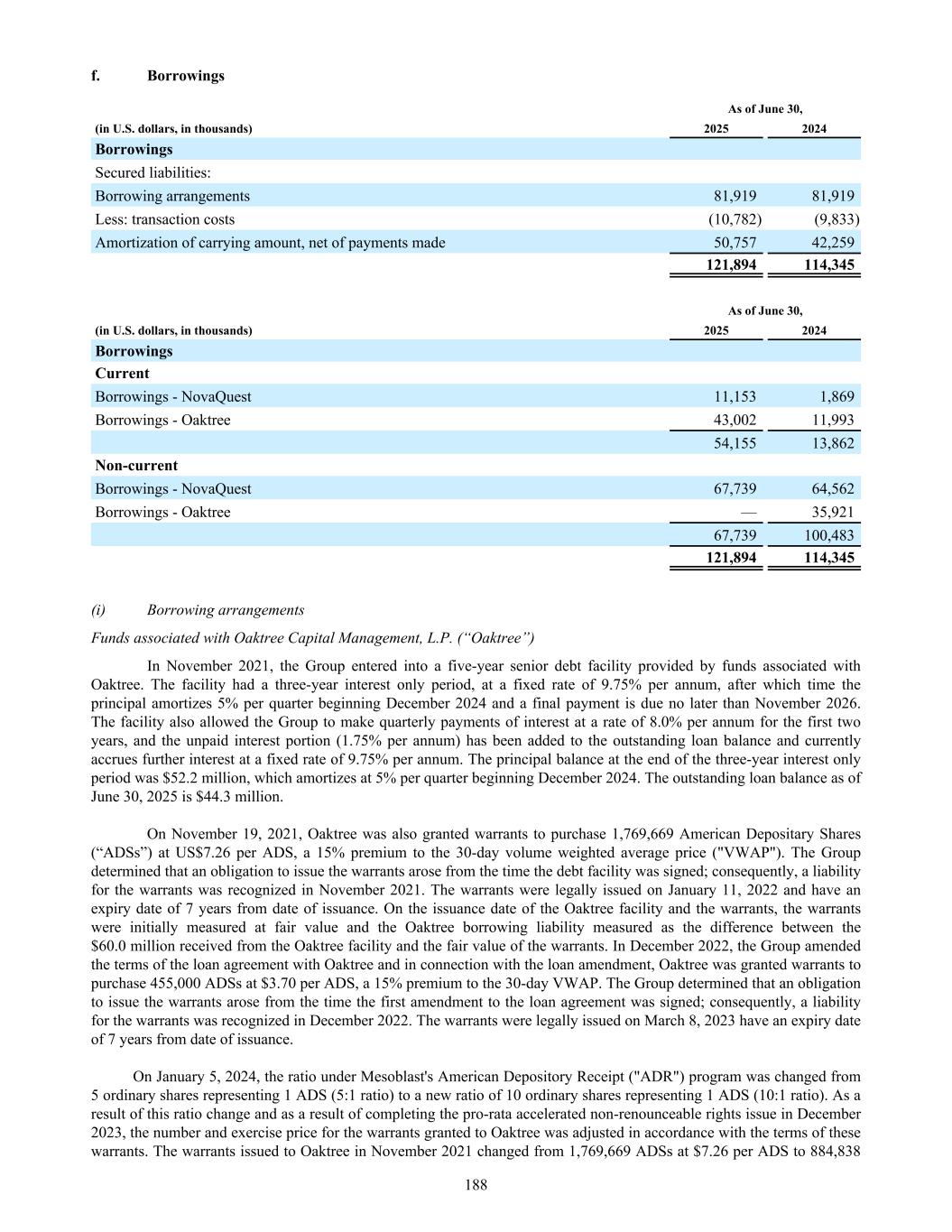 f. Borrowings As of June 30, (in U.S. dollars, in thousands) 2025 2024 Borrowings Secured liabilities: Borrowing arrangements 81,919 81,919 Less: transaction costs (10,782) (9,833) Amortization of carrying amount, net of payments made 50,757 42,259 121,894 114,345 As of June 30, (in U.S. dollars, in thousands) 2025 2024 Borrowings Current Borrowings - NovaQuest 11,153 1,869 Borrowings - Oaktree 43,002 11,993 54,155 13,862 Non-current Borrowings - NovaQuest 67,739 64,562 Borrowings - Oaktree — 35,921 67,739 100,483 121,894 114,345 (i) Borrowing arrangements Funds associated with Oaktree Capital Management, L.P. (“Oaktree”) In November 2021, the Group entered into a five-year senior debt facility provided by funds associated with Oaktree. The facility had a three-year interest only period, at a fixed rate of 9.75% per annum, after which time the principal amortizes 5% per quarter beginning December 2024 and a final payment is due no later than November 2026. The facility also allowed the Group to make quarterly payments of interest at a rate of 8.0% per annum for the first two years, and the unpaid interest portion (1.75% per annum) has been added to the outstanding loan balance and currently accrues further interest at a fixed rate of 9.75% per annum. The principal balance at the end of the three-year interest only period was $52.2 million, which amortizes at 5% per quarter beginning December 2024. The outstanding loan balance as of June 30, 2025 is $44.3 million. On November 19, 2021, Oaktree was also granted warrants to purchase 1,769,669 American Depositary Shares (“ADSs”) at US$7.26 per ADS, a 15% premium to the 30-day volume weighted average price ("VWAP"). The Group determined that an obligation to issue the warrants arose from the time the debt facility was signed; consequently, a liability for the warrants was recognized in November 2021. The warrants were legally issued on January 11, 2022 and have an expiry date of 7 years from date of issuance. On the issuance date of the Oaktree facility and the warrants, the warrants were initially measured at fair value and the Oaktree borrowing liability measured as the difference between the $60.0 million received from the Oaktree facility and the fair value of the warrants. In December 2022, the Group amended the terms of the loan agreement with Oaktree and in connection with the loan amendment, Oaktree was granted warrants to purchase 455,000 ADSs at $3.70 per ADS, a 15% premium to the 30-day VWAP. The Group determined that an obligation to issue the warrants arose from the time the first amendment to the loan agreement was signed; consequently, a liability for the warrants was recognized in December 2022. The warrants were legally issued on March 8, 2023 have an expiry date of 7 years from date of issuance. On January 5, 2024, the ratio under Mesoblast's American Depository Receipt ("ADR") program was changed from 5 ordinary shares representing 1 ADS (5:1 ratio) to a new ratio of 10 ordinary shares representing 1 ADS (10:1 ratio). As a result of this ratio change and as a result of completing the pro-rata accelerated non-renounceable rights issue in December 2023, the number and exercise price for the warrants granted to Oaktree was adjusted in accordance with the terms of these warrants. The warrants issued to Oaktree in November 2021 changed from 1,769,669 ADSs at $7.26 per ADS to 884,838 188