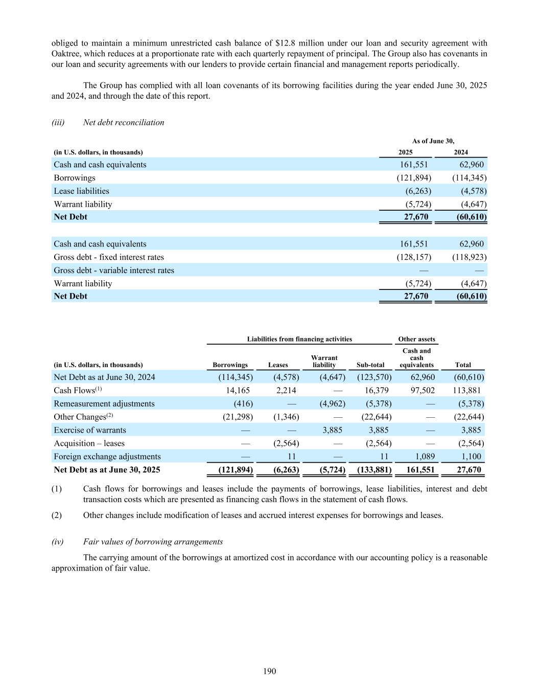 obliged to maintain a minimum unrestricted cash balance of $12.8 million under our loan and security agreement with Oaktree, which reduces at a proportionate rate with each quarterly repayment of principal. The Group also has covenants in our loan and security agreements with our lenders to provide certain financial and management reports periodically. The Group has complied with all loan covenants of its borrowing facilities during the year ended June 30, 2025 and 2024, and through the date of this report. (iii) Net debt reconciliation As of June 30, (in U.S. dollars, in thousands) 2025 2024 Cash and cash equivalents 161,551 62,960 Borrowings (121,894) (114,345) Lease liabilities (6,263) (4,578) Warrant liability (5,724) (4,647) Net Debt 27,670 (60,610) Cash and cash equivalents 161,551 62,960 Gross debt - fixed interest rates (128,157) (118,923) Gross debt - variable interest rates — — Warrant liability (5,724) (4,647) Net Debt 27,670 (60,610) Liabilities from financing activities Other assets (in U.S. dollars, in thousands) Borrowings Leases Warrant liability Sub-total Cash and cash equivalents Total Net Debt as at June 30, 2024 (114,345) (4,578) (4,647) (123,570) 62,960 (60,610) Cash Flows(1) 14,165 2,214 — 16,379 97,502 113,881 Remeasurement adjustments (416) — (4,962) (5,378) — (5,378) Other Changes(2) (21,298) (1,346) — (22,644) — (22,644) Exercise of warrants — — 3,885 3,885 — 3,885 Acquisition – leases — (2,564) — (2,564) — (2,564) Foreign exchange adjustments — 11 — 11 1,089 1,100 Net Debt as at June 30, 2025 (121,894) (6,263) (5,724) (133,881) 161,551 27,670 (1) Cash flows for borrowings and leases include the payments of borrowings, lease liabilities, interest and debt transaction costs which are presented as financing cash flows in the statement of cash flows. (2) Other changes include modification of leases and accrued interest expenses for borrowings and leases. (iv) Fair values of borrowing arrangements The carrying amount of the borrowings at amortized cost in accordance with our accounting policy is a reasonable approximation of fair value. 190