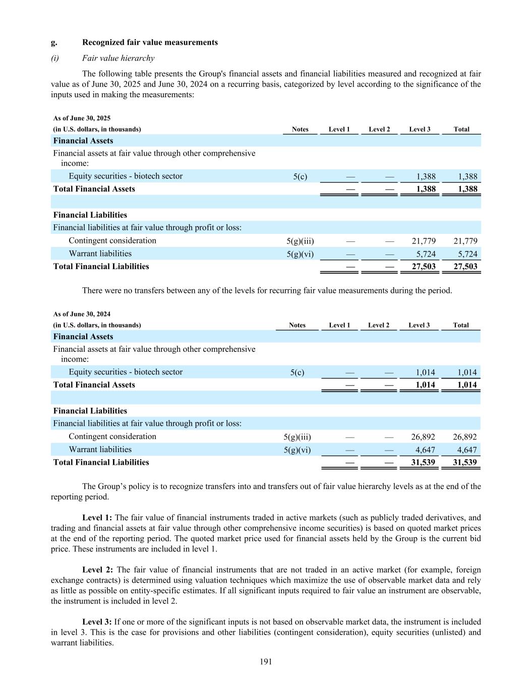 g. Recognized fair value measurements (i) Fair value hierarchy The following table presents the Group's financial assets and financial liabilities measured and recognized at fair value as of June 30, 2025 and June 30, 2024 on a recurring basis, categorized by level according to the significance of the inputs used in making the measurements: As of June 30, 2025 (in U.S. dollars, in thousands) Notes Level 1 Level 2 Level 3 Total Financial Assets Financial assets at fair value through other comprehensive income: Equity securities - biotech sector 5(c) — — 1,388 1,388 Total Financial Assets — — 1,388 1,388 Financial Liabilities Financial liabilities at fair value through profit or loss: Contingent consideration 5(g)(iii) — — 21,779 21,779 Warrant liabilities 5(g)(vi) — — 5,724 5,724 Total Financial Liabilities — — 27,503 27,503 There were no transfers between any of the levels for recurring fair value measurements during the period. As of June 30, 2024 (in U.S. dollars, in thousands) Notes Level 1 Level 2 Level 3 Total Financial Assets Financial assets at fair value through other comprehensive income: Equity securities - biotech sector 5(c) — — 1,014 1,014 Total Financial Assets — — 1,014 1,014 Financial Liabilities Financial liabilities at fair value through profit or loss: Contingent consideration 5(g)(iii) — — 26,892 26,892 Warrant liabilities 5(g)(vi) — — 4,647 4,647 Total Financial Liabilities — — 31,539 31,539 The Group’s policy is to recognize transfers into and transfers out of fair value hierarchy levels as at the end of the reporting period. Level 1: The fair value of financial instruments traded in active markets (such as publicly traded derivatives, and trading and financial assets at fair value through other comprehensive income securities) is based on quoted market prices at the end of the reporting period. The quoted market price used for financial assets held by the Group is the current bid price. These instruments are included in level 1. Level 2: The fair value of financial instruments that are not traded in an active market (for example, foreign exchange contracts) is determined using valuation techniques which maximize the use of observable market data and rely as little as possible on entity-specific estimates. If all significant inputs required to fair value an instrument are observable, the instrument is included in level 2. Level 3: If one or more of the significant inputs is not based on observable market data, the instrument is included in level 3. This is the case for provisions and other liabilities (contingent consideration), equity securities (unlisted) and warrant liabilities. 191