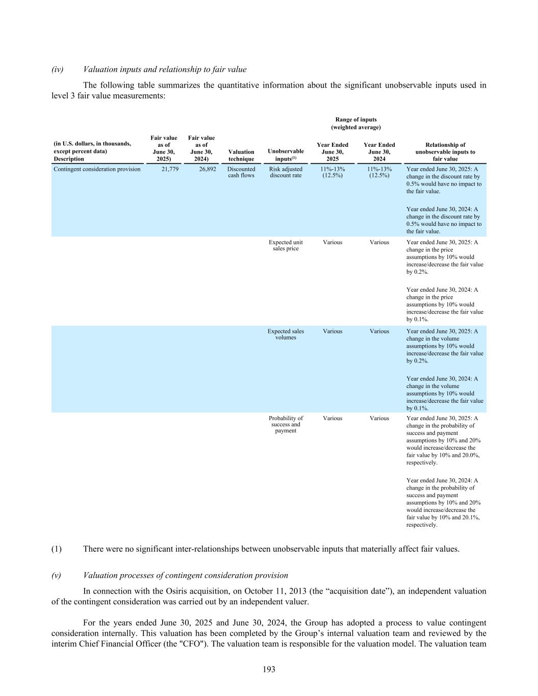 (iv) Valuation inputs and relationship to fair value The following table summarizes the quantitative information about the significant unobservable inputs used in level 3 fair value measurements: Range of inputs (weighted average) (in U.S. dollars, in thousands, except percent data) Description Fair value as of June 30, 2025) Fair value as of June 30, 2024) Valuation technique Unobservable inputs(1) Year Ended June 30, 2025 Year Ended June 30, 2024 Relationship of unobservable inputs to fair value Contingent consideration provision 21,779 26,892 Discounted cash flows Risk adjusted discount rate 11%-13% (12.5%) 11%-13% (12.5%) Year ended June 30, 2025: A change in the discount rate by 0.5% would have no impact to the fair value. Year ended June 30, 2024: A change in the discount rate by 0.5% would have no impact to the fair value. Expected unit sales price Various Various Year ended June 30, 2025: A change in the price assumptions by 10% would increase/decrease the fair value by 0.2%. Year ended June 30, 2024: A change in the price assumptions by 10% would increase/decrease the fair value by 0.1%. Expected sales volumes Various Various Year ended June 30, 2025: A change in the volume assumptions by 10% would increase/decrease the fair value by 0.2%. Year ended June 30, 2024: A change in the volume assumptions by 10% would increase/decrease the fair value by 0.1%. Probability of success and payment Various Various Year ended June 30, 2025: A change in the probability of success and payment assumptions by 10% and 20% would increase/decrease the fair value by 10% and 20.0%, respectively. Year ended June 30, 2024: A change in the probability of success and payment assumptions by 10% and 20% would increase/decrease the fair value by 10% and 20.1%, respectively. (1) There were no significant inter-relationships between unobservable inputs that materially affect fair values. (v) Valuation processes of contingent consideration provision In connection with the Osiris acquisition, on October 11, 2013 (the “acquisition date”), an independent valuation of the contingent consideration was carried out by an independent valuer. For the years ended June 30, 2025 and June 30, 2024, the Group has adopted a process to value contingent consideration internally. This valuation has been completed by the Group’s internal valuation team and reviewed by the interim Chief Financial Officer (the "CFO"). The valuation team is responsible for the valuation model. The valuation team 193