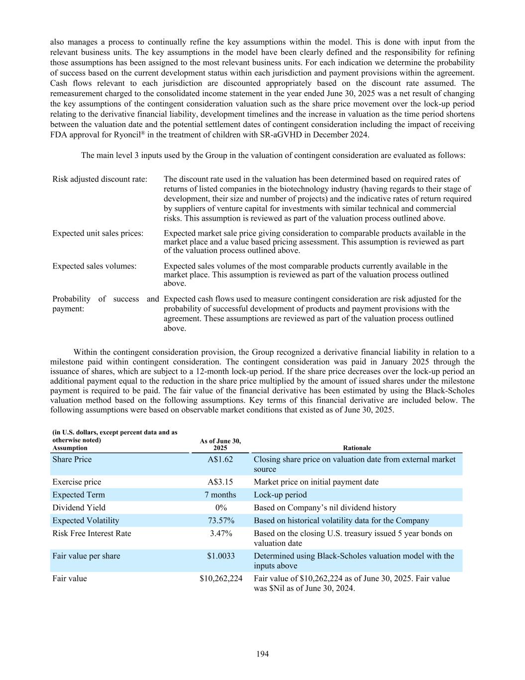 also manages a process to continually refine the key assumptions within the model. This is done with input from the relevant business units. The key assumptions in the model have been clearly defined and the responsibility for refining those assumptions has been assigned to the most relevant business units. For each indication we determine the probability of success based on the current development status within each jurisdiction and payment provisions within the agreement. Cash flows relevant to each jurisdiction are discounted appropriately based on the discount rate assumed. The remeasurement charged to the consolidated income statement in the year ended June 30, 2025 was a net result of changing the key assumptions of the contingent consideration valuation such as the share price movement over the lock-up period relating to the derivative financial liability, development timelines and the increase in valuation as the time period shortens between the valuation date and the potential settlement dates of contingent consideration including the impact of receiving FDA approval for Ryoncil® in the treatment of children with SR-aGVHD in December 2024. The main level 3 inputs used by the Group in the valuation of contingent consideration are evaluated as follows: Risk adjusted discount rate: The discount rate used in the valuation has been determined based on required rates of returns of listed companies in the biotechnology industry (having regards to their stage of development, their size and number of projects) and the indicative rates of return required by suppliers of venture capital for investments with similar technical and commercial risks. This assumption is reviewed as part of the valuation process outlined above. Expected unit sales prices: Expected market sale price giving consideration to comparable products available in the market place and a value based pricing assessment. This assumption is reviewed as part of the valuation process outlined above. Expected sales volumes: Expected sales volumes of the most comparable products currently available in the market place. This assumption is reviewed as part of the valuation process outlined above. Probability of success and payment: Expected cash flows used to measure contingent consideration are risk adjusted for the probability of successful development of products and payment provisions with the agreement. These assumptions are reviewed as part of the valuation process outlined above. Within the contingent consideration provision, the Group recognized a derivative financial liability in relation to a milestone paid within contingent consideration. The contingent consideration was paid in January 2025 through the issuance of shares, which are subject to a 12-month lock-up period. If the share price decreases over the lock-up period an additional payment equal to the reduction in the share price multiplied by the amount of issued shares under the milestone payment is required to be paid. The fair value of the financial derivative has been estimated by using the Black-Scholes valuation method based on the following assumptions. Key terms of this financial derivative are included below. The following assumptions were based on observable market conditions that existed as of June 30, 2025. (in U.S. dollars, except percent data and as otherwise noted) Assumption As of June 30, 2025 Rationale Share Price A$1.62 Closing share price on valuation date from external market source Exercise price A$3.15 Market price on initial payment date Expected Term 7 months Lock-up period Dividend Yield 0% Based on Company’s nil dividend history Expected Volatility 73.57% Based on historical volatility data for the Company Risk Free Interest Rate 3.47% Based on the closing U.S. treasury issued 5 year bonds on valuation date Fair value per share $1.0033 Determined using Black-Scholes valuation model with the inputs above Fair value $10,262,224 Fair value of $10,262,224 as of June 30, 2025. Fair value was $Nil as of June 30, 2024. 194