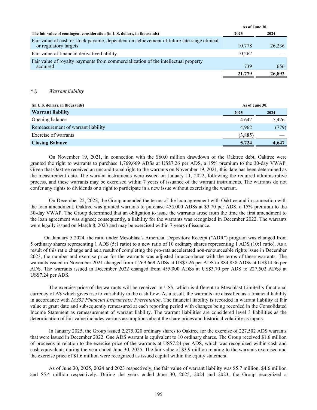 As of June 30, The fair value of contingent consideration (in U.S. dollars, in thousands) 2025 2024 Fair value of cash or stock payable, dependent on achievement of future late-stage clinical or regulatory targets 10,778 26,236 Fair value of financial derivative liability 10,262 — Fair value of royalty payments from commercialization of the intellectual property acquired 739 656 21,779 26,892 (vi) Warrant liability (in U.S. dollars, in thousands) As of June 30, Warrant liability 2025 2024 Opening balance 4,647 5,426 Remeasurement of warrant liability 4,962 (779) Exercise of warrants (3,885) — Closing Balance 5,724 4,647 On November 19, 2021, in connection with the $60.0 million drawdown of the Oaktree debt, Oaktree were granted the right to warrants to purchase 1,769,669 ADSs at US$7.26 per ADS, a 15% premium to the 30-day VWAP. Given that Oaktree received an unconditional right to the warrants on November 19, 2021, this date has been determined as the measurement date. The warrant instruments were issued on January 11, 2022, following the required administrative process, and these warrants may be exercised within 7 years of issuance of the warrant instruments. The warrants do not confer any rights to dividends or a right to participate in a new issue without exercising the warrant. On December 22, 2022, the Group amended the terms of the loan agreement with Oaktree and in connection with the loan amendment, Oaktree was granted warrants to purchase 455,000 ADSs at $3.70 per ADS, a 15% premium to the 30-day VWAP. The Group determined that an obligation to issue the warrants arose from the time the first amendment to the loan agreement was signed; consequently, a liability for the warrants was recognized in December 2022. The warrants were legally issued on March 8, 2023 and may be exercised within 7 years of issuance. On January 5 2024, the ratio under Mesoblast's American Depository Receipt ("ADR") program was changed from 5 ordinary shares representing 1 ADS (5:1 ratio) to a new ratio of 10 ordinary shares representing 1 ADS (10:1 ratio). As a result of this ratio change and as a result of completing the pro-rata accelerated non-renounceable rights issue in December 2023, the number and exercise price for the warrants was adjusted in accordance with the terms of these warrants. The warrants issued in November 2021 changed from 1,769,669 ADSs at US$7.26 per ADS to 884,838 ADSs at US$14.36 per ADS. The warrants issued in December 2022 changed from 455,000 ADSs at US$3.70 per ADS to 227,502 ADSs at US$7.24 per ADS. The exercise price of the warrants will be received in US$, which is different to Mesoblast Limited’s functional currency of A$ which gives rise to variability in the cash flow. As a result, the warrants are classified as a financial liability in accordance with IAS32 Financial Instruments: Presentation. The financial liability is recorded in warrant liability at fair value at grant date and subsequently remeasured at each reporting period with changes being recorded in the Consolidated Income Statement as remeasurement of warrant liability. The warrant liabilities are considered level 3 liabilities as the determination of fair value includes various assumptions about the share prices and historical volatility as inputs. In January 2025, the Group issued 2,275,020 ordinary shares to Oaktree for the exercise of 227,502 ADS warrants that were issued in December 2022. One ADS warrant is equivalent to 10 ordinary shares. The Group received $1.6 million of proceeds in relation to the exercise price of the warrants at US$7.24 per ADS, which was recognized within cash and cash equivalents during the year ended June 30, 2025. The fair value of $3.9 million relating to the warrants exercised and the exercise price of $1.6 million were recognized as issued capital within the equity statement. As of June 30, 2025, 2024 and 2023 respectively, the fair value of warrant liability was $5.7 million, $4.6 million and $5.4 million respectively. During the years ended June 30, 2025, 2024 and 2023, the Group recognized a 195