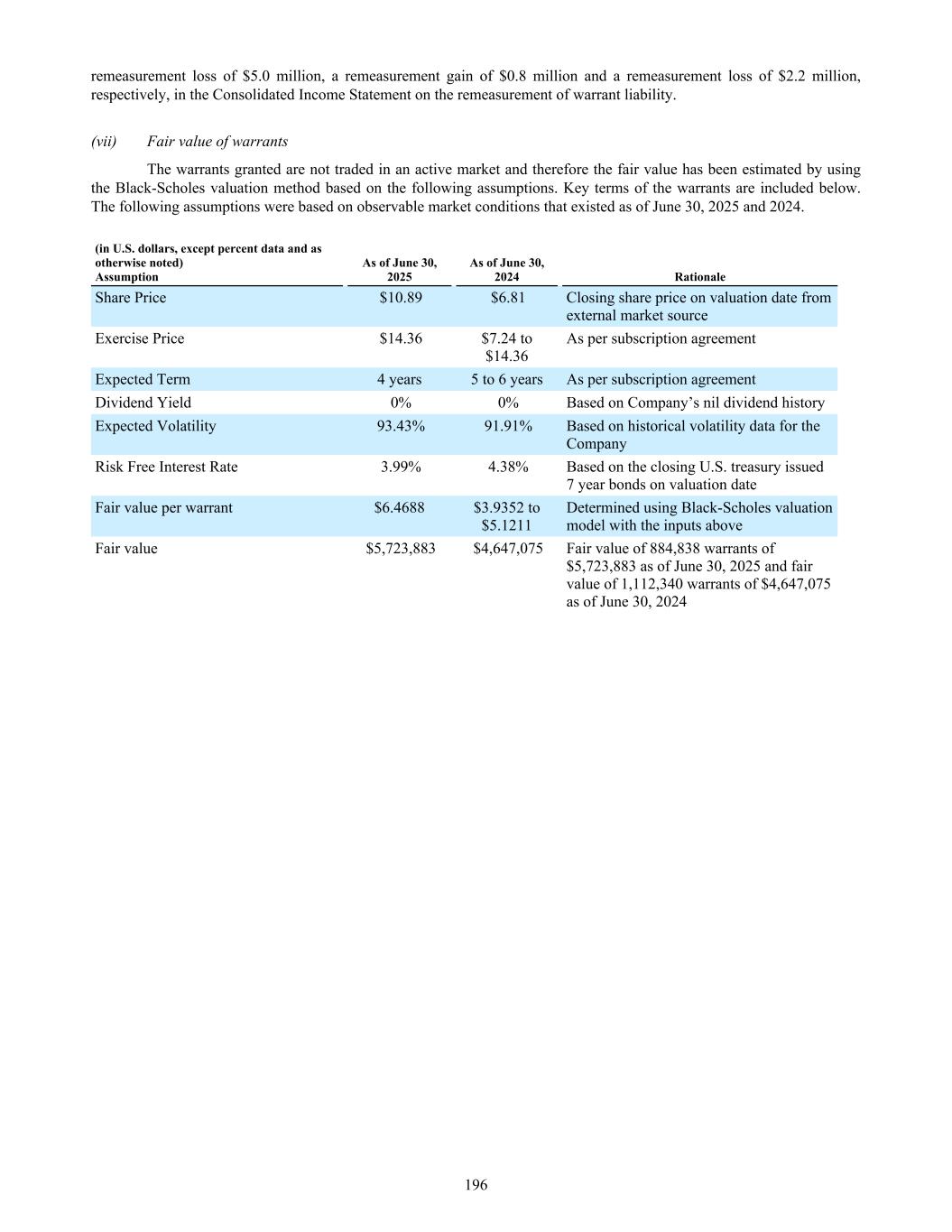 remeasurement loss of $5.0 million, a remeasurement gain of $0.8 million and a remeasurement loss of $2.2 million, respectively, in the Consolidated Income Statement on the remeasurement of warrant liability. (vii) Fair value of warrants The warrants granted are not traded in an active market and therefore the fair value has been estimated by using the Black-Scholes valuation method based on the following assumptions. Key terms of the warrants are included below. The following assumptions were based on observable market conditions that existed as of June 30, 2025 and 2024. (in U.S. dollars, except percent data and as otherwise noted) Assumption As of June 30, 2025 As of June 30, 2024 Rationale Share Price $10.89 $6.81 Closing share price on valuation date from external market source Exercise Price $14.36 $7.24 to $14.36 As per subscription agreement Expected Term 4 years 5 to 6 years As per subscription agreement Dividend Yield 0% 0% Based on Company’s nil dividend history Expected Volatility 93.43% 91.91% Based on historical volatility data for the Company Risk Free Interest Rate 3.99% 4.38% Based on the closing U.S. treasury issued 7 year bonds on valuation date Fair value per warrant $6.4688 $3.9352 to $5.1211 Determined using Black-Scholes valuation model with the inputs above Fair value $5,723,883 $4,647,075 Fair value of 884,838 warrants of $5,723,883 as of June 30, 2025 and fair value of 1,112,340 warrants of $4,647,075 as of June 30, 2024 196