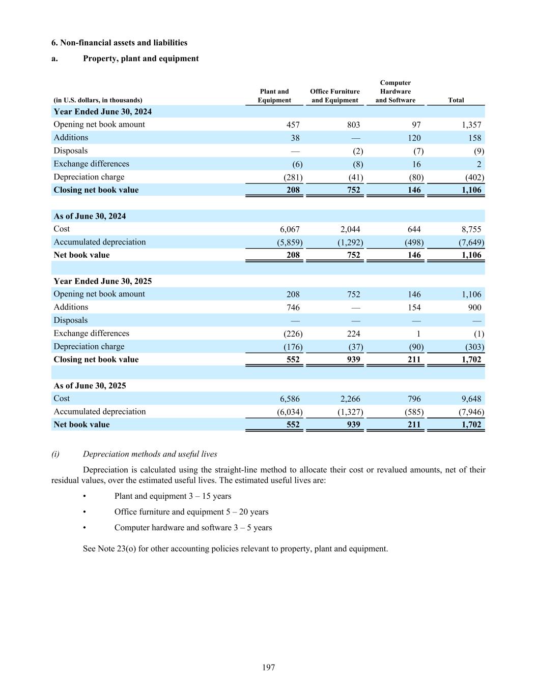 6. Non-financial assets and liabilities a. Property, plant and equipment (in U.S. dollars, in thousands) Plant and Equipment Office Furniture and Equipment Computer Hardware and Software Total Year Ended June 30, 2024 Opening net book amount 457 803 97 1,357 Additions 38 — 120 158 Disposals — (2) (7) (9) Exchange differences (6) (8) 16 2 Depreciation charge (281) (41) (80) (402) Closing net book value 208 752 146 1,106 As of June 30, 2024 Cost 6,067 2,044 644 8,755 Accumulated depreciation (5,859) (1,292) (498) (7,649) Net book value 208 752 146 1,106 Year Ended June 30, 2025 Opening net book amount 208 752 146 1,106 Additions 746 — 154 900 Disposals — — — — Exchange differences (226) 224 1 (1) Depreciation charge (176) (37) (90) (303) Closing net book value 552 939 211 1,702 As of June 30, 2025 Cost 6,586 2,266 796 9,648 Accumulated depreciation (6,034) (1,327) (585) (7,946) Net book value 552 939 211 1,702 (i) Depreciation methods and useful lives Depreciation is calculated using the straight-line method to allocate their cost or revalued amounts, net of their residual values, over the estimated useful lives. The estimated useful lives are: • Plant and equipment 3 – 15 years • Office furniture and equipment 5 – 20 years • Computer hardware and software 3 – 5 years See Note 23(o) for other accounting policies relevant to property, plant and equipment. 197