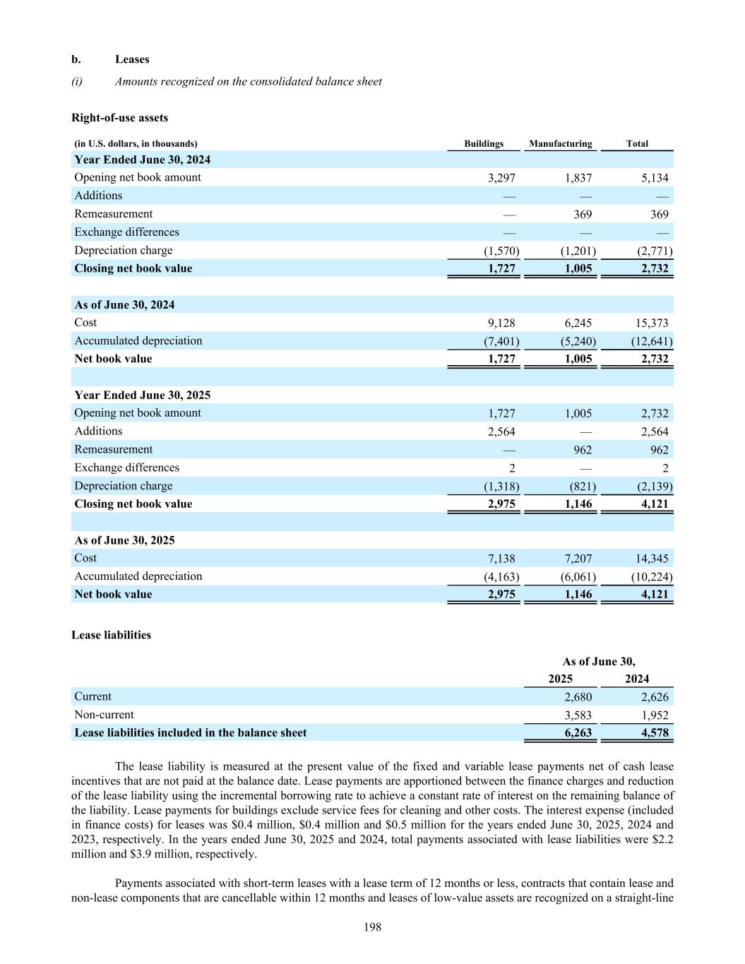 b. Leases (i) Amounts recognized on the consolidated balance sheet Right-of-use assets (in U.S. dollars, in thousands) Buildings Manufacturing Total Year Ended June 30, 2024 Opening net book amount 3,297 1,837 5,134 Additions — — — Remeasurement — 369 369 Exchange differences — — — Depreciation charge (1,570) (1,201) (2,771) Closing net book value 1,727 1,005 2,732 As of June 30, 2024 Cost 9,128 6,245 15,373 Accumulated depreciation (7,401) (5,240) (12,641) Net book value 1,727 1,005 2,732 Year Ended June 30, 2025 Opening net book amount 1,727 1,005 2,732 Additions 2,564 — 2,564 Remeasurement — 962 962 Exchange differences 2 — 2 Depreciation charge (1,318) (821) (2,139) Closing net book value 2,975 1,146 4,121 As of June 30, 2025 Cost 7,138 7,207 14,345 Accumulated depreciation (4,163) (6,061) (10,224) Net book value 2,975 1,146 4,121 Lease liabilities As of June 30, 2025 2024 Current 2,680 2,626 Non-current 3,583 1,952 Lease liabilities included in the balance sheet 6,263 4,578 The lease liability is measured at the present value of the fixed and variable lease payments net of cash lease incentives that are not paid at the balance date. Lease payments are apportioned between the finance charges and reduction of the lease liability using the incremental borrowing rate to achieve a constant rate of interest on the remaining balance of the liability. Lease payments for buildings exclude service fees for cleaning and other costs. The interest expense (included in finance costs) for leases was $0.4 million, $0.4 million and $0.5 million for the years ended June 30, 2025, 2024 and 2023, respectively. In the years ended June 30, 2025 and 2024, total payments associated with lease liabilities were $2.2 million and $3.9 million, respectively. Payments associated with short-term leases with a lease term of 12 months or less, contracts that contain lease and non-lease components that are cancellable within 12 months and leases of low-value assets are recognized on a straight-line 198