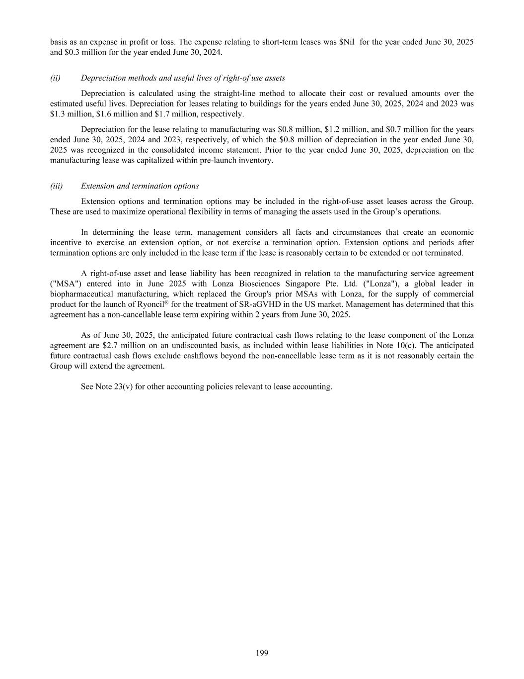 basis as an expense in profit or loss. The expense relating to short-term leases was $Nil for the year ended June 30, 2025 and $0.3 million for the year ended June 30, 2024. (ii) Depreciation methods and useful lives of right-of use assets Depreciation is calculated using the straight-line method to allocate their cost or revalued amounts over the estimated useful lives. Depreciation for leases relating to buildings for the years ended June 30, 2025, 2024 and 2023 was $1.3 million, $1.6 million and $1.7 million, respectively. Depreciation for the lease relating to manufacturing was $0.8 million, $1.2 million, and $0.7 million for the years ended June 30, 2025, 2024 and 2023, respectively, of which the $0.8 million of depreciation in the year ended June 30, 2025 was recognized in the consolidated income statement. Prior to the year ended June 30, 2025, depreciation on the manufacturing lease was capitalized within pre-launch inventory. (iii) Extension and termination options Extension options and termination options may be included in the right-of-use asset leases across the Group. These are used to maximize operational flexibility in terms of managing the assets used in the Group’s operations. In determining the lease term, management considers all facts and circumstances that create an economic incentive to exercise an extension option, or not exercise a termination option. Extension options and periods after termination options are only included in the lease term if the lease is reasonably certain to be extended or not terminated. A right-of-use asset and lease liability has been recognized in relation to the manufacturing service agreement ("MSA") entered into in June 2025 with Lonza Biosciences Singapore Pte. Ltd. ("Lonza"), a global leader in biopharmaceutical manufacturing, which replaced the Group's prior MSAs with Lonza, for the supply of commercial product for the launch of Ryoncil® for the treatment of SR-aGVHD in the US market. Management has determined that this agreement has a non-cancellable lease term expiring within 2 years from June 30, 2025. As of June 30, 2025, the anticipated future contractual cash flows relating to the lease component of the Lonza agreement are $2.7 million on an undiscounted basis, as included within lease liabilities in Note 10(c). The anticipated future contractual cash flows exclude cashflows beyond the non-cancellable lease term as it is not reasonably certain the Group will extend the agreement. See Note 23(v) for other accounting policies relevant to lease accounting. 199
