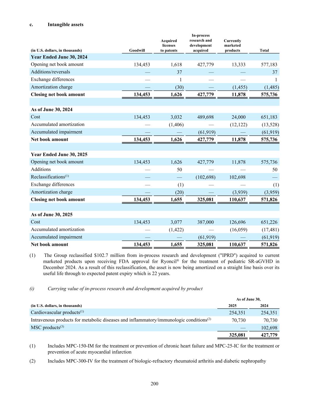 c. Intangible assets (in U.S. dollars, in thousands) Goodwill Acquired licenses to patents In-process research and development acquired Currently marketed products Total Year Ended June 30, 2024 Opening net book amount 134,453 1,618 427,779 13,333 577,183 Additions/reversals — 37 — — 37 Exchange differences — 1 — — 1 Amortization charge — (30) — (1,455) (1,485) Closing net book amount 134,453 1,626 427,779 11,878 575,736 As of June 30, 2024 Cost 134,453 3,032 489,698 24,000 651,183 Accumulated amortization — (1,406) — (12,122) (13,528) Accumulated impairment — — (61,919) — (61,919) Net book amount 134,453 1,626 427,779 11,878 575,736 Year Ended June 30, 2025 Opening net book amount 134,453 1,626 427,779 11,878 575,736 Additions — 50 — — 50 Reclassifications(1) — — (102,698) 102,698 — Exchange differences — (1) — — (1) Amortization charge — (20) — (3,939) (3,959) Closing net book amount 134,453 1,655 325,081 110,637 571,826 As of June 30, 2025 Cost 134,453 3,077 387,000 126,696 651,226 Accumulated amortization — (1,422) — (16,059) (17,481) Accumulated impairment — — (61,919) — (61,919) Net book amount 134,453 1,655 325,081 110,637 571,826 (1) The Group reclassified $102.7 million from in-process research and development ("IPRD") acquired to current marketed products upon receiving FDA approval for Ryoncil® for the treatment of pediatric SR-aGVHD in December 2024. As a result of this reclassification, the asset is now being amortized on a straight line basis over its useful life through to expected patent expiry which is 22 years. (i) Carrying value of in-process research and development acquired by product As of June 30, (in U.S. dollars, in thousands) 2025 2024 Cardiovascular products(1) 254,351 254,351 Intravenous products for metabolic diseases and inflammatory/immunologic conditions(2) 70,730 70,730 MSC products(3) — 102,698 325,081 427,779 (1) Includes MPC-150-IM for the treatment or prevention of chronic heart failure and MPC-25-IC for the treatment or prevention of acute myocardial infarction (2) Includes MPC-300-IV for the treatment of biologic-refractory rheumatoid arthritis and diabetic nephropathy 200