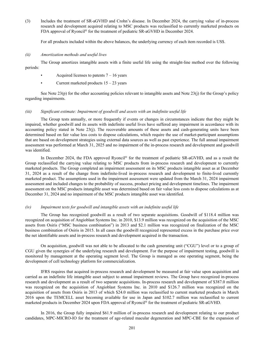 (3) Includes the treatment of SR-aGVHD and Crohn’s disease. In December 2024, the carrying value of in-process research and development acquired relating to MSC products was reclassified to currently marketed products on FDA approval of Ryoncil® for the treatment of pediatric SR-aGVHD in December 2024. For all products included within the above balances, the underlying currency of each item recorded is US$. (ii) Amortization methods and useful lives The Group amortizes intangible assets with a finite useful life using the straight-line method over the following periods: • Acquired licenses to patents 7 – 16 years • Current marketed products 15 – 23 years See Note 23(p) for the other accounting policies relevant to intangible assets and Note 23(j) for the Group’s policy regarding impairments. (iii) Significant estimate: Impairment of goodwill and assets with an indefinite useful life The Group tests annually, or more frequently if events or changes in circumstances indicate that they might be impaired, whether goodwill and its assets with indefinite useful lives have suffered any impairment in accordance with its accounting policy stated in Note 23(j). The recoverable amounts of these assets and cash-generating units have been determined based on fair value less costs to dispose calculations, which require the use of market-participant assumptions that are based on development strategies using external data sources as well as past experience. The full annual impairment assessment was performed at March 31, 2025 and no impairment of the in-process research and development and goodwill was identified. In December 2024, the FDA approved Ryoncil® for the treatment of pediatric SR-aGVHD, and as a result the Group reclassified the carrying value relating to MSC products from in-process research and development to currently marketed products. The Group completed an impairment assessment on its MSC products intangible asset as at December 31, 2024 as a result of the change from indefinite-lived in-process research and development to finite-lived currently marketed product. The assumptions used in the impairment assessment were updated from the March 31, 2024 impairment assessment and included changes to the probability of success, product pricing and development timelines. The impairment assessment on the MSC products intangible asset was determined based on fair value less costs to dispose calculations as at December 31, 2024 and no impairment of the MSC products intangible asset was identified. (iv) Impairment tests for goodwill and intangible assets with an indefinite useful life The Group has recognized goodwill as a result of two separate acquisitions. Goodwill of $118.4 million was recognized on acquisition of Angioblast Systems Inc. in 2010, $13.9 million was recognized on the acquisition of the MSC assets from Osiris (“MSC business combination”) in 2013 and $2.1 million was recognized on finalization of the MSC business combination of Osiris in 2015. In all cases the goodwill recognized represented excess in the purchase price over the net identifiable assets and in-process research and development acquired in the transaction. On acquisition, goodwill was not able to be allocated to the cash generating unit (“CGU”) level or to a group of CGU given the synergies of the underlying research and development. For the purpose of impairment testing, goodwill is monitored by management at the operating segment level. The Group is managed as one operating segment, being the development of cell technology platform for commercialization. IFRS requires that acquired in-process research and development be measured at fair value upon acquisition and carried as an indefinite life intangible asset subject to annual impairment reviews. The Group have recognized in-process research and development as a result of two separate acquisitions. In-process research and development of $387.0 million was recognized on the acquisition of Angioblast Systems Inc. in 2010 and $126.7 million was recognized on the acquisition of assets from Osiris in 2013 of which $24.0 million was reclassified to current marketed products in March 2016 upon the TEMCELL asset becoming available for use in Japan and $102.7 million was reclassified to current marketed products in December 2024 upon FDA approval of Ryoncil® for the treatment of pediatric SR-aGVHD. In 2016, the Group fully impaired $61.9 million of in-process research and development relating to our product candidates, MPC-MICRO-IO for the treatment of age-related macular degeneration and MPC-CBE for the expansion of 201