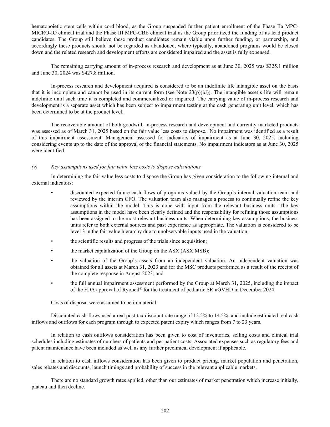 hematopoietic stem cells within cord blood, as the Group suspended further patient enrollment of the Phase IIa MPC- MICRO-IO clinical trial and the Phase III MPC-CBE clinical trial as the Group prioritized the funding of its lead product candidates. The Group still believe these product candidates remain viable upon further funding, or partnership, and accordingly these products should not be regarded as abandoned, where typically, abandoned programs would be closed down and the related research and development efforts are considered impaired and the asset is fully expensed. The remaining carrying amount of in-process research and development as at June 30, 2025 was $325.1 million and June 30, 2024 was $427.8 million. In-process research and development acquired is considered to be an indefinite life intangible asset on the basis that it is incomplete and cannot be used in its current form (see Note 23(p)(iii)). The intangible asset’s life will remain indefinite until such time it is completed and commercialized or impaired. The carrying value of in-process research and development is a separate asset which has been subject to impairment testing at the cash generating unit level, which has been determined to be at the product level. The recoverable amount of both goodwill, in-process research and development and currently marketed products was assessed as of March 31, 2025 based on the fair value less costs to dispose. No impairment was identified as a result of this impairment assessment. Management assessed for indicators of impairment as at June 30, 2025, including considering events up to the date of the approval of the financial statements. No impairment indicators as at June 30, 2025 were identified. (v) Key assumptions used for fair value less costs to dispose calculations In determining the fair value less costs to dispose the Group has given consideration to the following internal and external indicators: • discounted expected future cash flows of programs valued by the Group’s internal valuation team and reviewed by the interim CFO. The valuation team also manages a process to continually refine the key assumptions within the model. This is done with input from the relevant business units. The key assumptions in the model have been clearly defined and the responsibility for refining those assumptions has been assigned to the most relevant business units. When determining key assumptions, the business units refer to both external sources and past experience as appropriate. The valuation is considered to be level 3 in the fair value hierarchy due to unobservable inputs used in the valuation; • the scientific results and progress of the trials since acquisition; • the market capitalization of the Group on the ASX (ASX:MSB); • the valuation of the Group’s assets from an independent valuation. An independent valuation was obtained for all assets at March 31, 2023 and for the MSC products performed as a result of the receipt of the complete response in August 2023; and • the full annual impairment assessment performed by the Group at March 31, 2025, including the impact of the FDA approval of Ryoncil® for the treatment of pediatric SR-aGVHD in December 2024. Costs of disposal were assumed to be immaterial. Discounted cash-flows used a real post-tax discount rate range of 12.5% to 14.5%, and include estimated real cash inflows and outflows for each program through to expected patent expiry which ranges from 7 to 23 years. In relation to cash outflows consideration has been given to cost of inventories, selling costs and clinical trial schedules including estimates of numbers of patients and per patient costs. Associated expenses such as regulatory fees and patent maintenance have been included as well as any further preclinical development if applicable. In relation to cash inflows consideration has been given to product pricing, market population and penetration, sales rebates and discounts, launch timings and probability of success in the relevant applicable markets. There are no standard growth rates applied, other than our estimates of market penetration which increase initially, plateau and then decline. 202