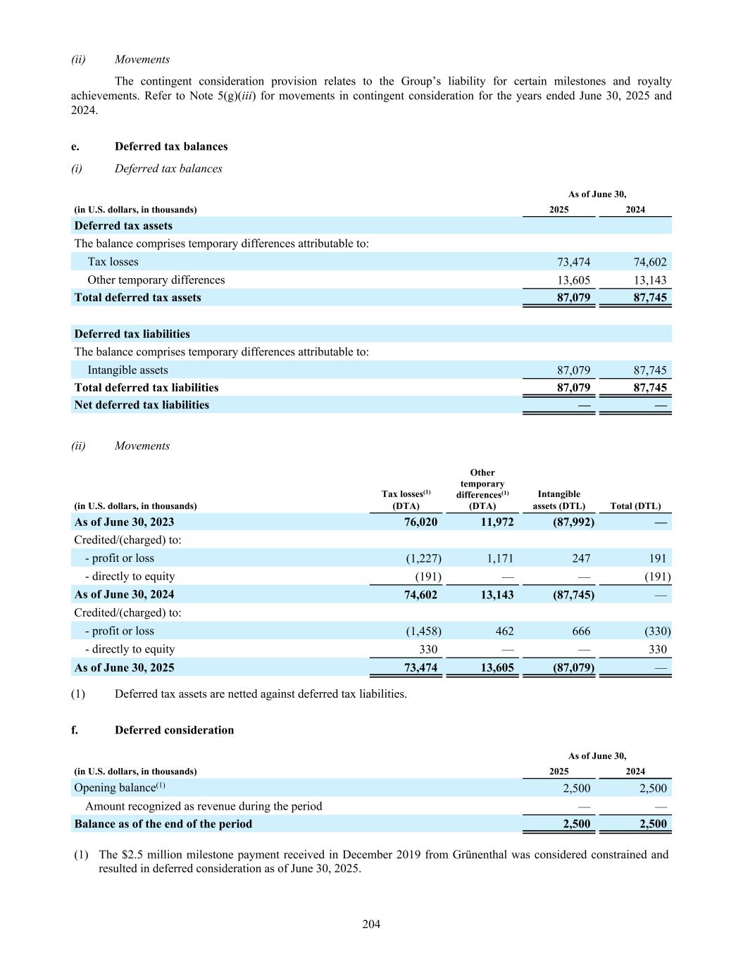 (ii) Movements The contingent consideration provision relates to the Group’s liability for certain milestones and royalty achievements. Refer to Note 5(g)(iii) for movements in contingent consideration for the years ended June 30, 2025 and 2024. e. Deferred tax balances (i) Deferred tax balances As of June 30, (in U.S. dollars, in thousands) 2025 2024 Deferred tax assets The balance comprises temporary differences attributable to: Tax losses 73,474 74,602 Other temporary differences 13,605 13,143 Total deferred tax assets 87,079 87,745 Deferred tax liabilities The balance comprises temporary differences attributable to: Intangible assets 87,079 87,745 Total deferred tax liabilities 87,079 87,745 Net deferred tax liabilities — — (ii) Movements (in U.S. dollars, in thousands) Tax losses(1) (DTA) Other temporary differences(1) (DTA) Intangible assets (DTL) Total (DTL) As of June 30, 2023 76,020 11,972 (87,992) — Credited/(charged) to: - profit or loss (1,227) 1,171 247 191 - directly to equity (191) — — (191) As of June 30, 2024 74,602 13,143 (87,745) — Credited/(charged) to: - profit or loss (1,458) 462 666 (330) - directly to equity 330 — — 330 As of June 30, 2025 73,474 13,605 (87,079) — (1) Deferred tax assets are netted against deferred tax liabilities. f. Deferred consideration As of June 30, (in U.S. dollars, in thousands) 2025 2024 Opening balance(1) 2,500 2,500 Amount recognized as revenue during the period — — Balance as of the end of the period 2,500 2,500 (1) The $2.5 million milestone payment received in December 2019 from Grünenthal was considered constrained and resulted in deferred consideration as of June 30, 2025. 204