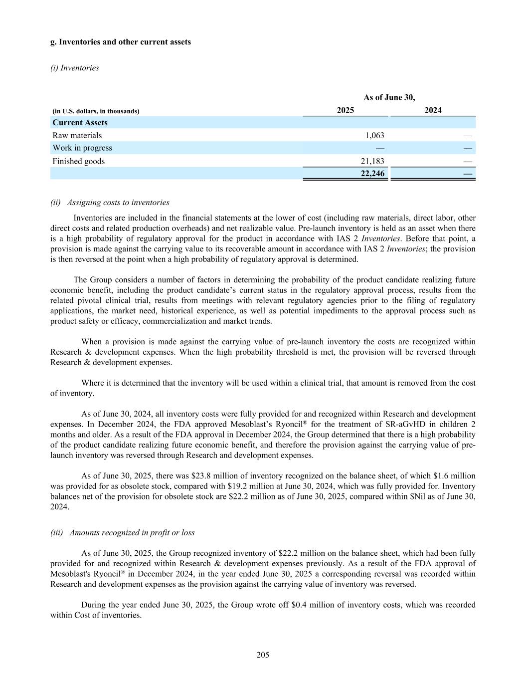 g. Inventories and other current assets (i) Inventories As of June 30, (in U.S. dollars, in thousands) 2025 2024 Current Assets Raw materials 1,063 — Work in progress — — Finished goods 21,183 — 22,246 — (ii) Assigning costs to inventories Inventories are included in the financial statements at the lower of cost (including raw materials, direct labor, other direct costs and related production overheads) and net realizable value. Pre-launch inventory is held as an asset when there is a high probability of regulatory approval for the product in accordance with IAS 2 Inventories. Before that point, a provision is made against the carrying value to its recoverable amount in accordance with IAS 2 Inventories; the provision is then reversed at the point when a high probability of regulatory approval is determined. The Group considers a number of factors in determining the probability of the product candidate realizing future economic benefit, including the product candidate’s current status in the regulatory approval process, results from the related pivotal clinical trial, results from meetings with relevant regulatory agencies prior to the filing of regulatory applications, the market need, historical experience, as well as potential impediments to the approval process such as product safety or efficacy, commercialization and market trends. When a provision is made against the carrying value of pre-launch inventory the costs are recognized within Research & development expenses. When the high probability threshold is met, the provision will be reversed through Research & development expenses. Where it is determined that the inventory will be used within a clinical trial, that amount is removed from the cost of inventory. As of June 30, 2024, all inventory costs were fully provided for and recognized within Research and development expenses. In December 2024, the FDA approved Mesoblast’s Ryoncil® for the treatment of SR-aGvHD in children 2 months and older. As a result of the FDA approval in December 2024, the Group determined that there is a high probability of the product candidate realizing future economic benefit, and therefore the provision against the carrying value of pre- launch inventory was reversed through Research and development expenses. As of June 30, 2025, there was $23.8 million of inventory recognized on the balance sheet, of which $1.6 million was provided for as obsolete stock, compared with $19.2 million at June 30, 2024, which was fully provided for. Inventory balances net of the provision for obsolete stock are $22.2 million as of June 30, 2025, compared within $Nil as of June 30, 2024. (iii) Amounts recognized in profit or loss As of June 30, 2025, the Group recognized inventory of $22.2 million on the balance sheet, which had been fully provided for and recognized within Research & development expenses previously. As a result of the FDA approval of Mesoblast's Ryoncil® in December 2024, in the year ended June 30, 2025 a corresponding reversal was recorded within Research and development expenses as the provision against the carrying value of inventory was reversed. During the year ended June 30, 2025, the Group wrote off $0.4 million of inventory costs, which was recorded within Cost of inventories. 205