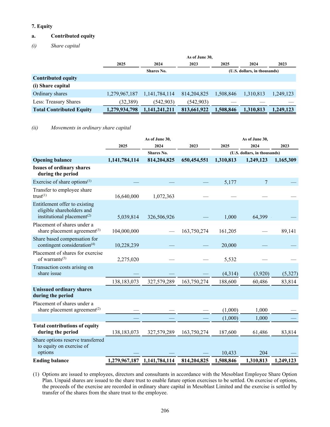 7. Equity a. Contributed equity (i) Share capital As of June 30, 2025 2024 2023 2025 2024 2023 Shares No. (U.S. dollars, in thousands) Contributed equity (i) Share capital Ordinary shares 1,279,967,187 1,141,784,114 814,204,825 1,508,846 1,310,813 1,249,123 Less: Treasury Shares (32,389) (542,903) (542,903) — — — Total Contributed Equity 1,279,934,798 1,141,241,211 813,661,922 1,508,846 1,310,813 1,249,123 (ii) Movements in ordinary share capital As of June 30, As of June 30, 2025 2024 2023 2025 2024 2023 Shares No. (U.S. dollars, in thousands) Opening balance 1,141,784,114 814,204,825 650,454,551 1,310,813 1,249,123 1,165,309 Issues of ordinary shares during the period Exercise of share options(1) — — — 5,177 7 — Transfer to employee share trust(1) 16,640,000 1,072,363 — — — — Entitlement offer to existing eligible shareholders and institutional placement(2) 5,039,814 326,506,926 — 1,000 64,399 — — Placement of shares under a share placement agreement(3) 104,000,000 — 163,750,274 161,205 — 89,141 Share based compensation for contingent consideration(4) 10,228,239 — — 20,000 — — Placement of shares for exercise of warrants(5) 2,275,020 — — 5,532 — — Transaction costs arising on share issue — — — (4,314) (3,920) (5,327) 138,183,073 327,579,289 163,750,274 188,600 60,486 83,814 Unissued ordinary shares during the period Placement of shares under a share placement agreement(2) — — — (1,000) 1,000 — — — — (1,000) 1,000 — Total contributions of equity during the period 138,183,073 327,579,289 163,750,274 187,600 61,486 83,814 Share options reserve transferred to equity on exercise of options — — — 10,433 204 — Ending balance 1,279,967,187 1,141,784,114 814,204,825 1,508,846 1,310,813 1,249,123 (1) Options are issued to employees, directors and consultants in accordance with the Mesoblast Employee Share Option Plan. Unpaid shares are issued to the share trust to enable future option exercises to be settled. On exercise of options, the proceeds of the exercise are recorded in ordinary share capital in Mesoblast Limited and the exercise is settled by transfer of the shares from the share trust to the employee. 206