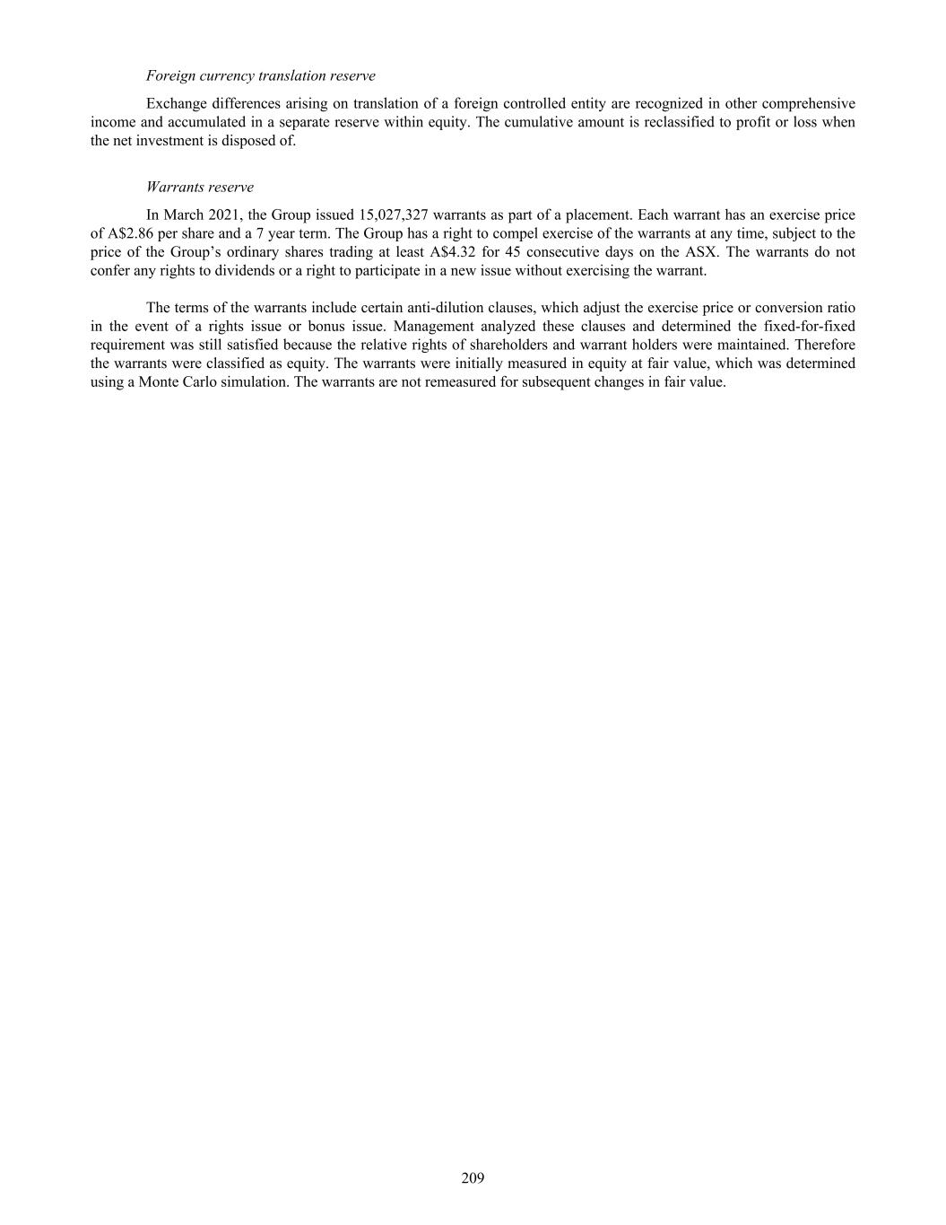 Foreign currency translation reserve Exchange differences arising on translation of a foreign controlled entity are recognized in other comprehensive income and accumulated in a separate reserve within equity. The cumulative amount is reclassified to profit or loss when the net investment is disposed of. Warrants reserve In March 2021, the Group issued 15,027,327 warrants as part of a placement. Each warrant has an exercise price of A$2.86 per share and a 7 year term. The Group has a right to compel exercise of the warrants at any time, subject to the price of the Group’s ordinary shares trading at least A$4.32 for 45 consecutive days on the ASX. The warrants do not confer any rights to dividends or a right to participate in a new issue without exercising the warrant. The terms of the warrants include certain anti-dilution clauses, which adjust the exercise price or conversion ratio in the event of a rights issue or bonus issue. Management analyzed these clauses and determined the fixed-for-fixed requirement was still satisfied because the relative rights of shareholders and warrant holders were maintained. Therefore the warrants were classified as equity. The warrants were initially measured in equity at fair value, which was determined using a Monte Carlo simulation. The warrants are not remeasured for subsequent changes in fair value. 209