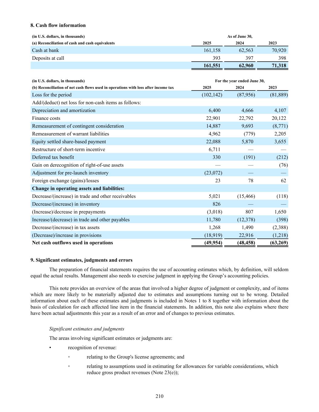8. Cash flow information (in U.S. dollars, in thousands) As of June 30, (a) Reconciliation of cash and cash equivalents 2025 2024 2023 Cash at bank 161,158 62,563 70,920 Deposits at call 393 397 398 161,551 62,960 71,318 (in U.S. dollars, in thousands) For the year ended June 30, (b) Reconciliation of net cash flows used in operations with loss after income tax 2025 2024 2023 Loss for the period (102,142) (87,956) (81,889) Add/(deduct) net loss for non-cash items as follows: Depreciation and amortization 6,400 4,666 4,107 Finance costs 22,901 22,792 20,122 Remeasurement of contingent consideration 14,887 9,693 (8,771) Remeasurement of warrant liabilities 4,962 (779) 2,205 Equity settled share-based payment 22,088 5,870 3,655 Restructure of short-term incentive 6,711 — — Deferred tax benefit 330 (191) (212) Gain on derecognition of right-of-use assets — — (76) Adjustment for pre-launch inventory (23,072) — — Foreign exchange (gains)/losses 23 78 62 Change in operating assets and liabilities: Decrease/(increase) in trade and other receivables 5,021 (15,466) (118) Decrease/(increase) in inventory 826 — — (Increase)/decrease in prepayments (3,018) 807 1,650 Increase/(decrease) in trade and other payables 11,780 (12,378) (398) Decrease/(increase) in tax assets 1,268 1,490 (2,388) (Decrease)/increase in provisions (18,919) 22,916 (1,218) Net cash outflows used in operations (49,954) (48,458) (63,269) 9. Significant estimates, judgments and errors The preparation of financial statements requires the use of accounting estimates which, by definition, will seldom equal the actual results. Management also needs to exercise judgment in applying the Group’s accounting policies. This note provides an overview of the areas that involved a higher degree of judgment or complexity, and of items which are more likely to be materially adjusted due to estimates and assumptions turning out to be wrong. Detailed information about each of these estimates and judgments is included in Notes 1 to 8 together with information about the basis of calculation for each affected line item in the financial statements. In addition, this note also explains where there have been actual adjustments this year as a result of an error and of changes to previous estimates. Significant estimates and judgments The areas involving significant estimates or judgments are: • recognition of revenue: ◦ relating to the Group's license agreements; and ◦ relating to assumptions used in estimating for allowances for variable considerations, which reduce gross product revenues (Note 23(e)); 210