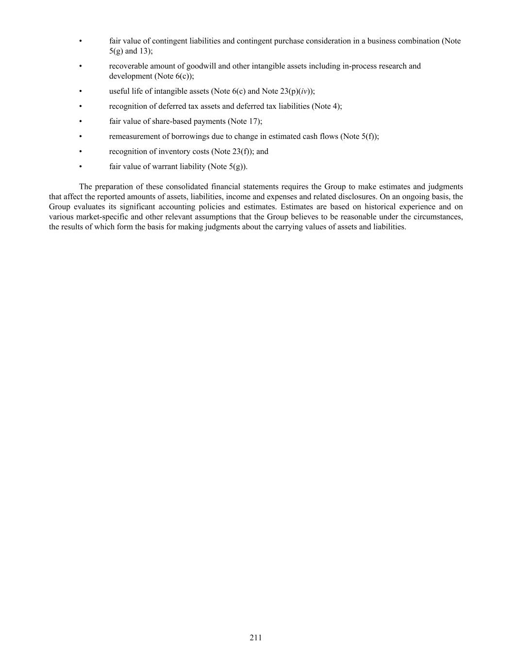 • fair value of contingent liabilities and contingent purchase consideration in a business combination (Note 5(g) and 13); • recoverable amount of goodwill and other intangible assets including in-process research and development (Note 6(c)); • useful life of intangible assets (Note 6(c) and Note 23(p)(iv)); • recognition of deferred tax assets and deferred tax liabilities (Note 4); • fair value of share-based payments (Note 17); • remeasurement of borrowings due to change in estimated cash flows (Note 5(f)); • recognition of inventory costs (Note 23(f)); and • fair value of warrant liability (Note 5(g)). The preparation of these consolidated financial statements requires the Group to make estimates and judgments that affect the reported amounts of assets, liabilities, income and expenses and related disclosures. On an ongoing basis, the Group evaluates its significant accounting policies and estimates. Estimates are based on historical experience and on various market-specific and other relevant assumptions that the Group believes to be reasonable under the circumstances, the results of which form the basis for making judgments about the carrying values of assets and liabilities. 211