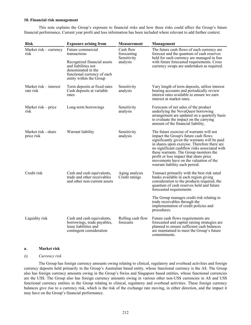 10. Financial risk management This note explains the Group’s exposure to financial risks and how these risks could affect the Group’s future financial performance. Current year profit and loss information has been included where relevant to add further context. Risk Exposure arising from Measurement Management Market risk – currency risk Future commercial transactions Recognized financial assets and liabilities not denominated in the functional currency of each entity within the Group Cash flow forecasting Sensitivity analysis The future cash flows of each currency are forecast and the quantum of cash reserves held for each currency are managed in line with future forecasted requirements. Cross currency swaps are undertaken as required. Market risk – interest rate risk Term deposits at fixed rates Cash deposits at variable rates Sensitivity analysis Vary length of term deposits, utilize interest bearing accounts and periodically review interest rates available to ensure we earn interest at market rates. Market risk – price risk Long-term borrowings Sensitivity analysis Forecasts of net sales of the product underlying the NovaQuest borrowing arrangement are updated on a quarterly basis to evaluate the impact on the carrying amount of the financial liability. Market risk - share price risk Warrant liability Sensitivity analysis The future exercise of warrants will not impact the Group's future cash flows significantly given the warrants will be paid in shares upon exercise. Therefore there are no significant cashflow risks associated with these warrants. The Group monitors the profit or loss impact that share price movements have on the valuation of the warrant liability each period. Credit risk Cash and cash equivalents, trade and other receivables and other non-current assets Aging analysis Credit ratings Transact primarily with the best risk rated banks available in each region giving consideration to the products required, the quantum of cash reserves held and future forecasted requirements The Group manages credit risk relating to trade receivables through the implementation of credit policies and procedures. Liquidity risk Cash and cash equivalents, borrowings, trade payables, lease liabilities and contingent consideration Rolling cash flow forecasts Future cash flows requirements are forecasted and capital raising strategies are planned to ensure sufficient cash balances are maintained to meet the Group’s future commitments. a. Market risk (i) Currency risk The Group has foreign currency amounts owing relating to clinical, regulatory and overhead activities and foreign currency deposits held primarily in the Group’s Australian based entity, whose functional currency is the A$. The Group also has foreign currency amounts owing in the Group’s Swiss and Singapore based entities, whose functional currencies are the US$. The Group also has foreign currency amounts owing in various other non-US$ currencies in A$ and US$ functional currency entities in the Group relating to clinical, regulatory and overhead activities. These foreign currency balances give rise to a currency risk, which is the risk of the exchange rate moving, in either direction, and the impact it may have on the Group’s financial performance. 212