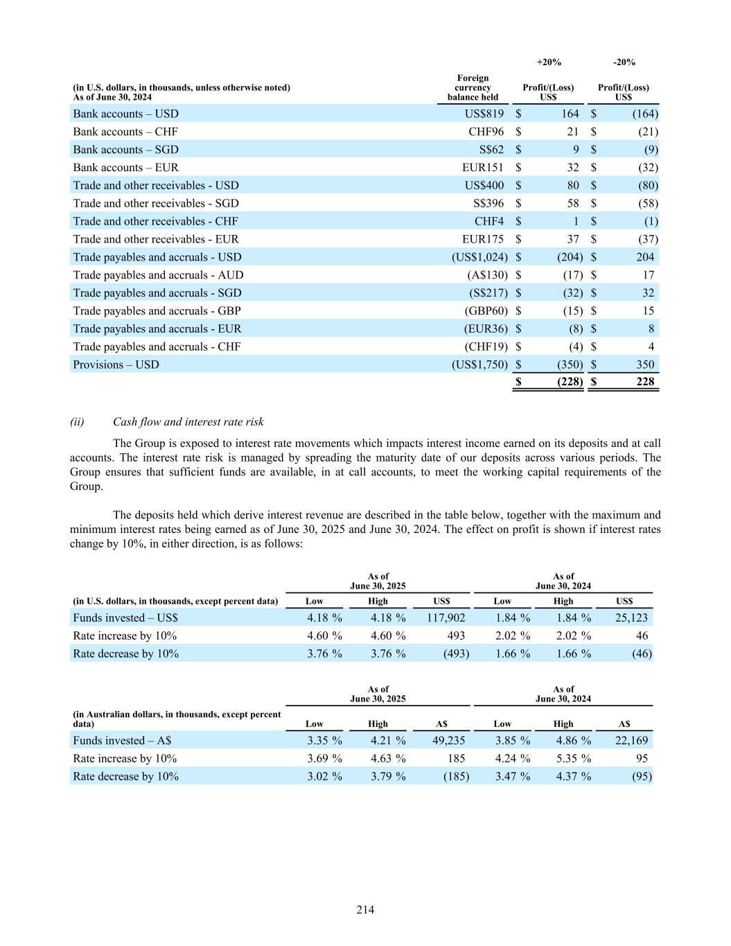 +20% -20% (in U.S. dollars, in thousands, unless otherwise noted) As of June 30, 2024 Foreign currency balance held Profit/(Loss) US$ Profit/(Loss) US$ Bank accounts – USD US$819 $ 164 $ (164) Bank accounts – CHF CHF96 $ 21 $ (21) Bank accounts – SGD S$62 $ 9 $ (9) Bank accounts – EUR EUR151 $ 32 $ (32) Trade and other receivables - USD US$400 $ 80 $ (80) Trade and other receivables - SGD S$396 $ 58 $ (58) Trade and other receivables - CHF CHF4 $ 1 $ (1) Trade and other receivables - EUR EUR175 $ 37 $ (37) Trade payables and accruals - USD (US$1,024) $ (204) $ 204 Trade payables and accruals - AUD (A$130) $ (17) $ 17 Trade payables and accruals - SGD (S$217) $ (32) $ 32 Trade payables and accruals - GBP (GBP60) $ (15) $ 15 Trade payables and accruals - EUR (EUR36) $ (8) $ 8 Trade payables and accruals - CHF (CHF19) $ (4) $ 4 Provisions – USD (US$1,750) $ (350) $ 350 $ (228) $ 228 (ii) Cash flow and interest rate risk The Group is exposed to interest rate movements which impacts interest income earned on its deposits and at call accounts. The interest rate risk is managed by spreading the maturity date of our deposits across various periods. The Group ensures that sufficient funds are available, in at call accounts, to meet the working capital requirements of the Group. The deposits held which derive interest revenue are described in the table below, together with the maximum and minimum interest rates being earned as of June 30, 2025 and June 30, 2024. The effect on profit is shown if interest rates change by 10%, in either direction, is as follows: As of June 30, 2025 As of June 30, 2024 (in U.S. dollars, in thousands, except percent data) Low High US$ Low High US$ Funds invested – US$ 4.18 % 4.18 % 117,902 1.84 % 1.84 % 25,123 Rate increase by 10% 4.60 % 4.60 % 493 2.02 % 2.02 % 46 Rate decrease by 10% 3.76 % 3.76 % (493) 1.66 % 1.66 % (46) As of June 30, 2025 As of June 30, 2024 (in Australian dollars, in thousands, except percent data) Low High A$ Low High A$ Funds invested – A$ 3.35 % 4.21 % 49,235 3.85 % 4.86 % 22,169 Rate increase by 10% 3.69 % 4.63 % 185 4.24 % 5.35 % 95 Rate decrease by 10% 3.02 % 3.79 % (185) 3.47 % 4.37 % (95) 214