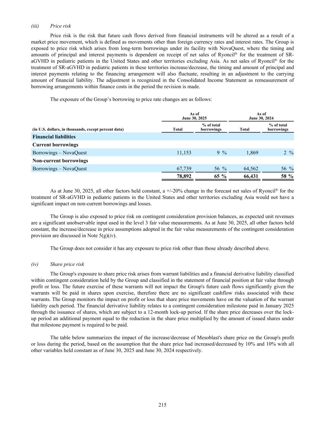 (iii) Price risk Price risk is the risk that future cash flows derived from financial instruments will be altered as a result of a market price movement, which is defined as movements other than foreign currency rates and interest rates. The Group is exposed to price risk which arises from long-term borrowings under its facility with NovaQuest, where the timing and amounts of principal and interest payments is dependent on receipt of net sales of Ryoncil® for the treatment of SR- aGVHD in pediatric patients in the United States and other territories excluding Asia. As net sales of Ryoncil® for the treatment of SR-aGVHD in pediatric patients in these territories increase/decrease, the timing and amount of principal and interest payments relating to the financing arrangement will also fluctuate, resulting in an adjustment to the carrying amount of financial liability. The adjustment is recognized in the Consolidated Income Statement as remeasurement of borrowing arrangements within finance costs in the period the revision is made. The exposure of the Group’s borrowing to price rate changes are as follows: As of June 30, 2025 As of June 30, 2024 (in U.S. dollars, in thousands, except percent data) Total % of total borrowings Total % of total borrowings Financial liabilities Current borrowings Borrowings – NovaQuest 11,153 9 % 1,869 2 % Non-current borrowings Borrowings – NovaQuest 67,739 56 % 64,562 56 % 78,892 65 % 66,431 58 % As at June 30, 2025, all other factors held constant, a +/-20% change in the forecast net sales of Ryoncil® for the treatment of SR-aGVHD in pediatric patients in the United States and other territories excluding Asia would not have a significant impact on non-current borrowings and losses. The Group is also exposed to price risk on contingent consideration provision balances, as expected unit revenues are a significant unobservable input used in the level 3 fair value measurements. As at June 30, 2025, all other factors held constant, the increase/decrease in price assumptions adopted in the fair value measurements of the contingent consideration provision are discussed in Note 5(g)(iv). The Group does not consider it has any exposure to price risk other than those already described above. (iv) Share price risk The Group's exposure to share price risk arises from warrant liabilities and a financial derivative liability classified within contingent consideration held by the Group and classified in the statement of financial position at fair value through profit or loss. The future exercise of these warrants will not impact the Group's future cash flows significantly given the warrants will be paid in shares upon exercise, therefore there are no significant cashflow risks associated with these warrants. The Group monitors the impact on profit or loss that share price movements have on the valuation of the warrant liability each period. The financial derivative liability relates to a contingent consideration milestone paid in January 2025 through the issuance of shares, which are subject to a 12-month lock-up period. If the share price decreases over the lock- up period an additional payment equal to the reduction in the share price multiplied by the amount of issued shares under that milestone payment is required to be paid. The table below summarizes the impact of the increase/decrease of Mesoblast's share price on the Group's profit or loss during the period, based on the assumption that the share price had increased/decreased by 10% and 10% with all other variables held constant as of June 30, 2025 and June 30, 2024 respectively. 215