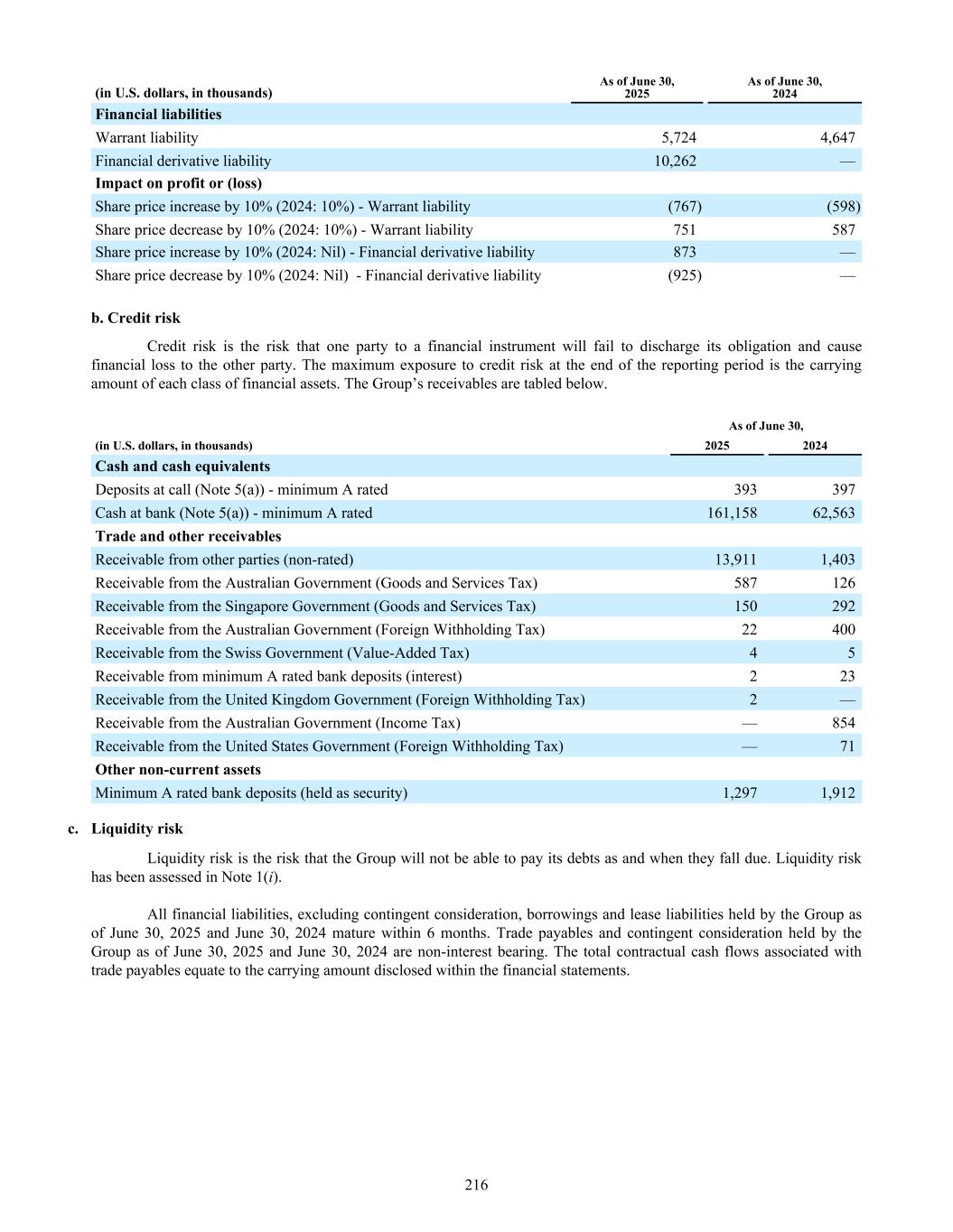 (in U.S. dollars, in thousands) As of June 30, 2025 As of June 30, 2024 Financial liabilities Warrant liability 5,724 4,647 Financial derivative liability 10,262 — Impact on profit or (loss) Share price increase by 10% (2024: 10%) - Warrant liability (767) (598) Share price decrease by 10% (2024: 10%) - Warrant liability 751 587 Share price increase by 10% (2024: Nil) - Financial derivative liability 873 — Share price decrease by 10% (2024: Nil) - Financial derivative liability (925) — b. Credit risk Credit risk is the risk that one party to a financial instrument will fail to discharge its obligation and cause financial loss to the other party. The maximum exposure to credit risk at the end of the reporting period is the carrying amount of each class of financial assets. The Group’s receivables are tabled below. As of June 30, (in U.S. dollars, in thousands) 2025 2024 Cash and cash equivalents Deposits at call (Note 5(a)) - minimum A rated 393 397 Cash at bank (Note 5(a)) - minimum A rated 161,158 62,563 Trade and other receivables Receivable from other parties (non-rated) 13,911 1,403 Receivable from the Australian Government (Goods and Services Tax) 587 126 Receivable from the Singapore Government (Goods and Services Tax) 150 292 Receivable from the Australian Government (Foreign Withholding Tax) 22 400 Receivable from the Swiss Government (Value-Added Tax) 4 5 Receivable from minimum A rated bank deposits (interest) 2 23 Receivable from the United Kingdom Government (Foreign Withholding Tax) 2 — Receivable from the Australian Government (Income Tax) — 854 Receivable from the United States Government (Foreign Withholding Tax) — 71 Other non-current assets Minimum A rated bank deposits (held as security) 1,297 1,912 c. Liquidity risk Liquidity risk is the risk that the Group will not be able to pay its debts as and when they fall due. Liquidity risk has been assessed in Note 1(i). All financial liabilities, excluding contingent consideration, borrowings and lease liabilities held by the Group as of June 30, 2025 and June 30, 2024 mature within 6 months. Trade payables and contingent consideration held by the Group as of June 30, 2025 and June 30, 2024 are non-interest bearing. The total contractual cash flows associated with trade payables equate to the carrying amount disclosed within the financial statements. 216