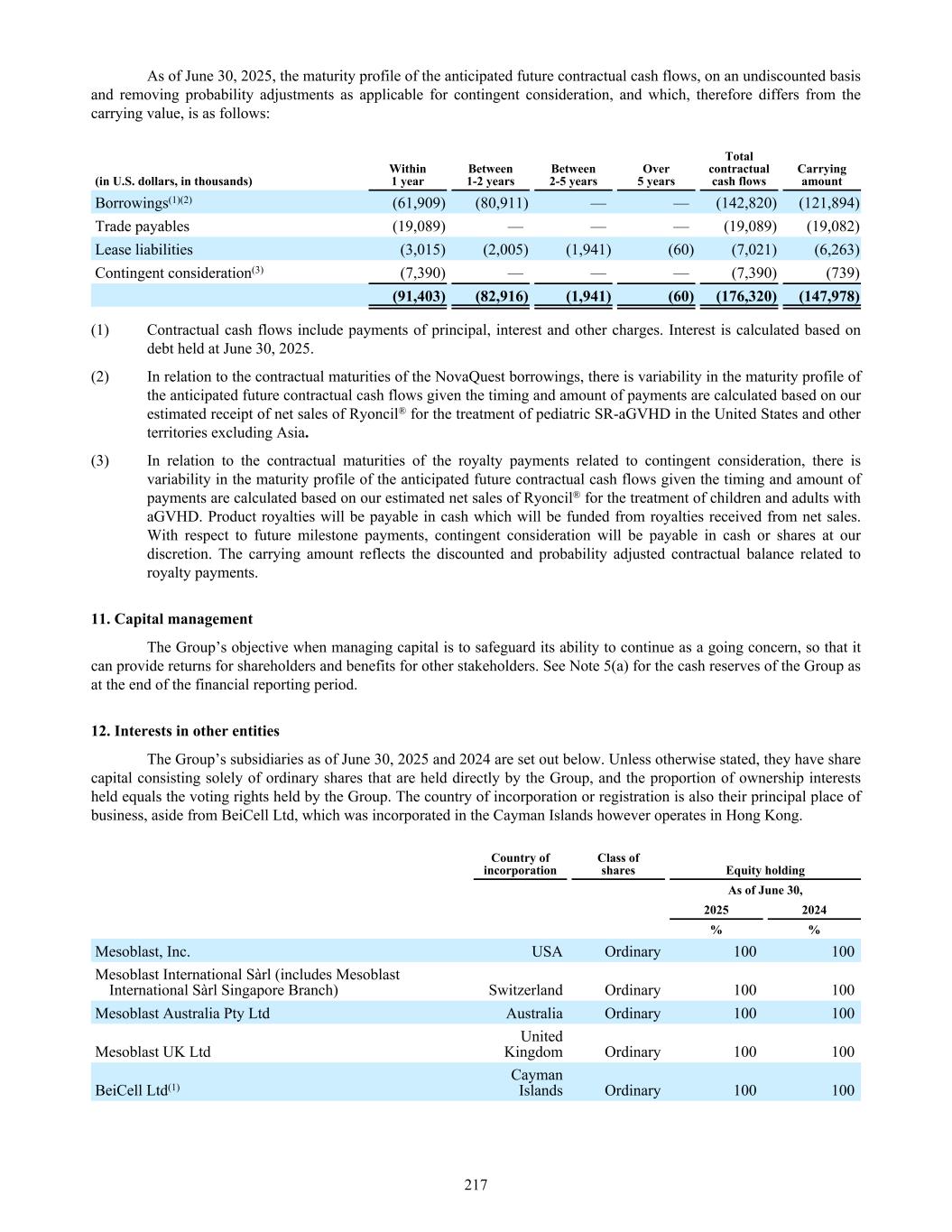 As of June 30, 2025, the maturity profile of the anticipated future contractual cash flows, on an undiscounted basis and removing probability adjustments as applicable for contingent consideration, and which, therefore differs from the carrying value, is as follows: (in U.S. dollars, in thousands) Within 1 year Between 1-2 years Between 2-5 years Over 5 years Total contractual cash flows Carrying amount Borrowings(1)(2) (61,909) (80,911) — — (142,820) (121,894) Trade payables (19,089) — — — (19,089) (19,082) Lease liabilities (3,015) (2,005) (1,941) (60) (7,021) (6,263) Contingent consideration(3) (7,390) — — — (7,390) (739) (91,403) (82,916) (1,941) (60) (176,320) (147,978) (1) Contractual cash flows include payments of principal, interest and other charges. Interest is calculated based on debt held at June 30, 2025. (2) In relation to the contractual maturities of the NovaQuest borrowings, there is variability in the maturity profile of the anticipated future contractual cash flows given the timing and amount of payments are calculated based on our estimated receipt of net sales of Ryoncil® for the treatment of pediatric SR-aGVHD in the United States and other territories excluding Asia. (3) In relation to the contractual maturities of the royalty payments related to contingent consideration, there is variability in the maturity profile of the anticipated future contractual cash flows given the timing and amount of payments are calculated based on our estimated net sales of Ryoncil® for the treatment of children and adults with aGVHD. Product royalties will be payable in cash which will be funded from royalties received from net sales. With respect to future milestone payments, contingent consideration will be payable in cash or shares at our discretion. The carrying amount reflects the discounted and probability adjusted contractual balance related to royalty payments. 11. Capital management The Group’s objective when managing capital is to safeguard its ability to continue as a going concern, so that it can provide returns for shareholders and benefits for other stakeholders. See Note 5(a) for the cash reserves of the Group as at the end of the financial reporting period. 12. Interests in other entities The Group’s subsidiaries as of June 30, 2025 and 2024 are set out below. Unless otherwise stated, they have share capital consisting solely of ordinary shares that are held directly by the Group, and the proportion of ownership interests held equals the voting rights held by the Group. The country of incorporation or registration is also their principal place of business, aside from BeiCell Ltd, which was incorporated in the Cayman Islands however operates in Hong Kong. Country of incorporation Class of shares Equity holding As of June 30, 2025 2024 % % Mesoblast, Inc. USA Ordinary 100 100 Mesoblast International Sàrl (includes Mesoblast International Sàrl Singapore Branch) Switzerland Ordinary 100 100 Mesoblast Australia Pty Ltd Australia Ordinary 100 100 Mesoblast UK Ltd United Kingdom Ordinary 100 100 BeiCell Ltd(1) Cayman Islands Ordinary 100 100 217
