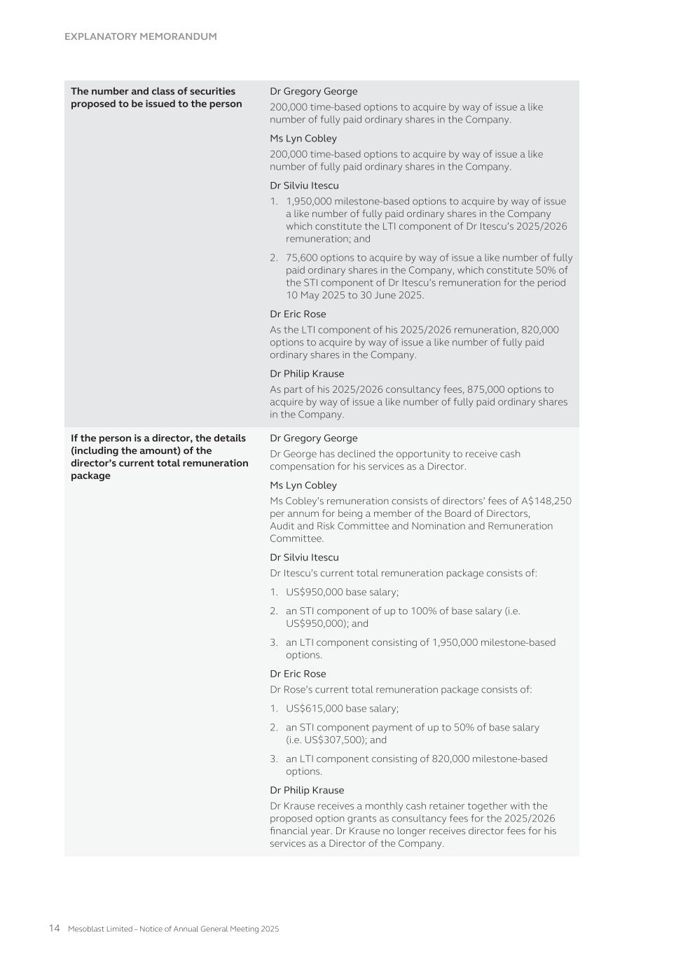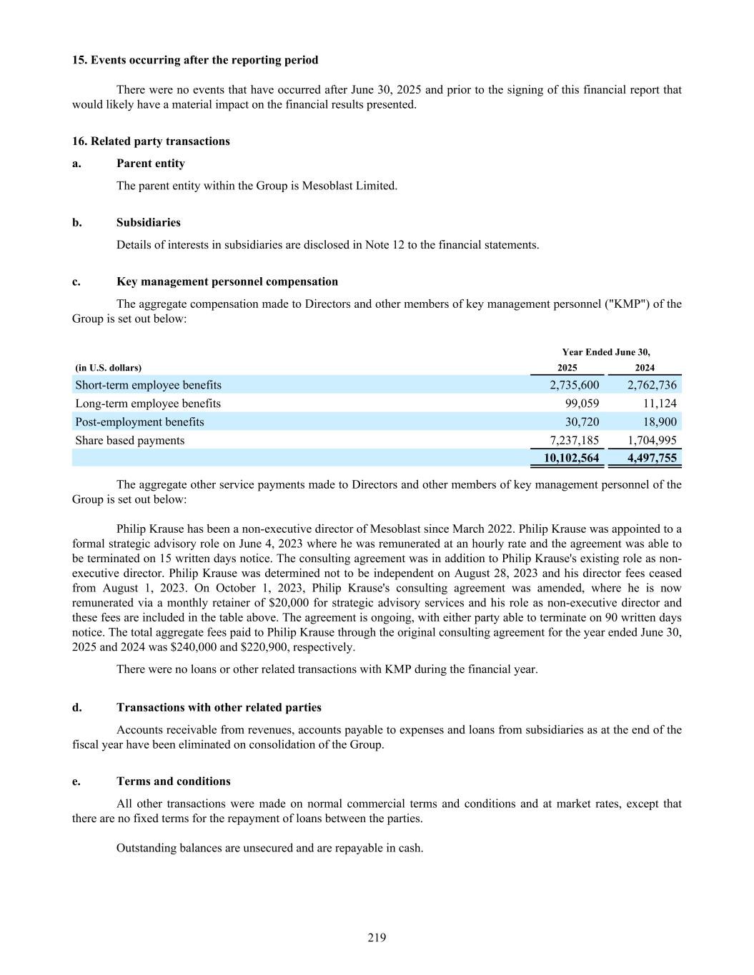 15. Events occurring after the reporting period There were no events that have occurred after June 30, 2025 and prior to the signing of this financial report that would likely have a material impact on the financial results presented. 16. Related party transactions a. Parent entity The parent entity within the Group is Mesoblast Limited. b. Subsidiaries Details of interests in subsidiaries are disclosed in Note 12 to the financial statements. c. Key management personnel compensation The aggregate compensation made to Directors and other members of key management personnel ("KMP") of the Group is set out below: Year Ended June 30, (in U.S. dollars) 2025 2024 Short-term employee benefits 2,735,600 2,762,736 Long-term employee benefits 99,059 11,124 Post-employment benefits 30,720 18,900 Share based payments 7,237,185 1,704,995 10,102,564 4,497,755 The aggregate other service payments made to Directors and other members of key management personnel of the Group is set out below: Philip Krause has been a non-executive director of Mesoblast since March 2022. Philip Krause was appointed to a formal strategic advisory role on June 4, 2023 where he was remunerated at an hourly rate and the agreement was able to be terminated on 15 written days notice. The consulting agreement was in addition to Philip Krause's existing role as non- executive director. Philip Krause was determined not to be independent on August 28, 2023 and his director fees ceased from August 1, 2023. On October 1, 2023, Philip Krause's consulting agreement was amended, where he is now remunerated via a monthly retainer of $20,000 for strategic advisory services and his role as non-executive director and these fees are included in the table above. The agreement is ongoing, with either party able to terminate on 90 written days notice. The total aggregate fees paid to Philip Krause through the original consulting agreement for the year ended June 30, 2025 and 2024 was $240,000 and $220,900, respectively. There were no loans or other related transactions with KMP during the financial year. d. Transactions with other related parties Accounts receivable from revenues, accounts payable to expenses and loans from subsidiaries as at the end of the fiscal year have been eliminated on consolidation of the Group. e. Terms and conditions All other transactions were made on normal commercial terms and conditions and at market rates, except that there are no fixed terms for the repayment of loans between the parties. Outstanding balances are unsecured and are repayable in cash. 219