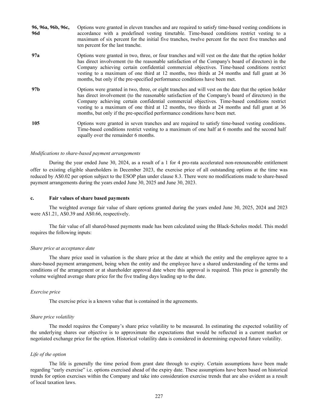 96, 96a, 96b, 96c, 96d Options were granted in eleven tranches and are required to satisfy time-based vesting conditions in accordance with a predefined vesting timetable. Time-based conditions restrict vesting to a maximum of six percent for the initial five tranches, twelve percent for the next five tranches and ten percent for the last tranche. 97a Options were granted in two, three, or four tranches and will vest on the date that the option holder has direct involvement (to the reasonable satisfaction of the Company's board of directors) in the Company achieving certain confidential commercial objectives. Time-based conditions restrict vesting to a maximum of one third at 12 months, two thirds at 24 months and full grant at 36 months, but only if the pre-specified performance conditions have been met. 97b Options were granted in two, three, or eight tranches and will vest on the date that the option holder has direct involvement (to the reasonable satisfaction of the Company's board of directors) in the Company achieving certain confidential commercial objectives. Time-based conditions restrict vesting to a maximum of one third at 12 months, two thirds at 24 months and full grant at 36 months, but only if the pre-specified performance conditions have been met. 105 Options were granted in seven tranches and are required to satisfy time-based vesting conditions. Time-based conditions restrict vesting to a maximum of one half at 6 months and the second half equally over the remainder 6 months. Modifications to share-based payment arrangements During the year ended June 30, 2024, as a result of a 1 for 4 pro-rata accelerated non-renounceable entitlement offer to existing eligible shareholders in December 2023, the exercise price of all outstanding options at the time was reduced by A$0.02 per option subject to the ESOP plan under clause 8.3. There were no modifications made to share-based payment arrangements during the years ended June 30, 2025 and June 30, 2023. c. Fair values of share based payments The weighted average fair value of share options granted during the years ended June 30, 2025, 2024 and 2023 were A$1.21, A$0.39 and A$0.66, respectively. The fair value of all shared-based payments made has been calculated using the Black-Scholes model. This model requires the following inputs: Share price at acceptance date The share price used in valuation is the share price at the date at which the entity and the employee agree to a share-based payment arrangement, being when the entity and the employee have a shared understanding of the terms and conditions of the arrangement or at shareholder approval date where this approval is required. This price is generally the volume weighted average share price for the five trading days leading up to the date. Exercise price The exercise price is a known value that is contained in the agreements. Share price volatility The model requires the Company’s share price volatility to be measured. In estimating the expected volatility of the underlying shares our objective is to approximate the expectations that would be reflected in a current market or negotiated exchange price for the option. Historical volatility data is considered in determining expected future volatility. Life of the option The life is generally the time period from grant date through to expiry. Certain assumptions have been made regarding “early exercise” i.e. options exercised ahead of the expiry date. These assumptions have been based on historical trends for option exercises within the Company and take into consideration exercise trends that are also evident as a result of local taxation laws. 227