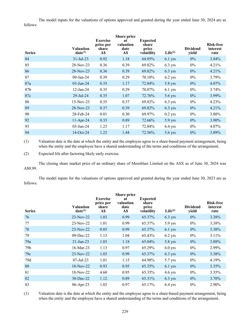 The model inputs for the valuations of options approved and granted during the year ended June 30, 2024 are as follows: Series Valuation date(1) Exercise price per share A$ Share price at valuation date A$ Expected share price volatility Life(2) Dividend yield Risk-free interest rate 84 31-Jul-23 0.92 1.18 64.95% 6.1 yrs 0% 3.84% 85 28-Nov-23 0.36 0.39 69.82% 6.3 yrs 0% 4.21% 86 28-Nov-23 0.36 0.39 69.82% 6.3 yrs 0% 4.21% 87 09-Jan-24 0.39 0.29 70.10% 6.2 yrs 0% 3.79% 87a 03-Jun-24 0.35 1.17 72.84% 5.8 yrs 0% 4.07% 87b 12-Jan-24 0.35 0.29 70.07% 6.1 yrs 0% 3.74% 87c 29-Jul-24 0.35 1.07 72.76% 5.6 yrs 0% 3.99% 88 15-Nov-23 0.35 0.37 69.82% 6.3 yrs 0% 4.23% 89 28-Nov-23 0.37 0.39 69.82% 6.3 yrs 0% 4.21% 90 28-Feb-24 0.01 0.30 69.97% 0.2 yrs 0% 3.80% 92 11-Apr-24 0.35 0.89 72.66% 5.9 yrs 0% 3.90% 93 03-Jun-24 1.23 1.17 72.84% 6.4 yrs 0% 4.07% 94 14-Oct-24 1.23 1.44 72.56% 5.6 yrs 0% 3.89% (1) Valuation date is the date at which the entity and the employee agree to a share-based payment arrangement, being when the entity and the employee have a shared understanding of the terms and conditions of the arrangement. (2) Expected life after factoring likely early exercise. The closing share market price of an ordinary share of Mesoblast Limited on the ASX as of June 30, 2024 was A$0.99. The model inputs for the valuations of options approved and granted during the year ended June 30, 2023 are as follows: Series Valuation date(1) Exercise price per share A$ Share price at valuation date A$ Expected share price volatility Life(2) Dividend yield Risk-free interest rate 76 23-Nov-22 1.03 0.99 65.37% 6.3 yrs 0% 3.38% 77 23-Nov-22 1.01 0.99 65.37% 5.9 yrs 0% 3.38% 78 23-Nov-22 0.85 0.99 65.37% 6.1 yrs 0% 3.38% 79 09-Dec-22 1.13 1.04 65.43% 6.2 yrs 0% 3.11% 79a 21-Jun-23 1.03 1.18 65.04% 5.8 yrs 0% 3.88% 79b 16-Mar-23 1.13 0.97 65.29% 6.0 yrs 0% 2.99% 79c 23-Nov-22 1.03 0.99 65.37% 6.3 yrs 0% 3.38% 79d 07-Jul-23 1.01 1.15 64.98% 5.7 yrs 0% 4.19% 80 18-Nov-22 0.93 0.95 65.35% 6.1 yrs 0% 3.35% 81 18-Nov-22 4.60 0.95 65.35% 4.6 yrs 0% 3.35% 82 30-Dec-22 1.12 0.89 65.31% 6.3 yrs 0% 3.70% 83 06-Apr-23 1.03 0.97 65.17% 6.4 yrs 0% 2.90% (1) Valuation date is the date at which the entity and the employee agree to a share-based payment arrangement, being when the entity and the employee have a shared understanding of the terms and conditions of the arrangement. 229