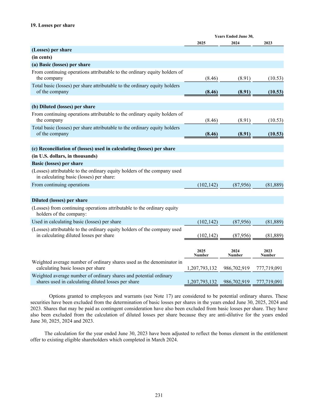19. Losses per share Years Ended June 30, 2025 2024 2023 (Losses) per share (in cents) (a) Basic (losses) per share From continuing operations attributable to the ordinary equity holders of the company (8.46) (8.91) (10.53) Total basic (losses) per share attributable to the ordinary equity holders of the company (8.46) (8.91) (10.53) (b) Diluted (losses) per share From continuing operations attributable to the ordinary equity holders of the company (8.46) (8.91) (10.53) Total basic (losses) per share attributable to the ordinary equity holders of the company (8.46) (8.91) (10.53) (c) Reconciliation of (losses) used in calculating (losses) per share (in U.S. dollars, in thousands) Basic (losses) per share (Losses) attributable to the ordinary equity holders of the company used in calculating basic (losses) per share: From continuing operations (102,142) (87,956) (81,889) Diluted (losses) per share (Losses) from continuing operations attributable to the ordinary equity holders of the company: Used in calculating basic (losses) per share (102,142) (87,956) (81,889) (Losses) attributable to the ordinary equity holders of the company used in calculating diluted losses per share (102,142) (87,956) (81,889) 2025 Number 2024 Number 2023 Number Weighted average number of ordinary shares used as the denominator in calculating basic losses per share 1,207,793,132 986,702,919 777,719,091 Weighted average number of ordinary shares and potential ordinary shares used in calculating diluted losses per share 1,207,793,132 986,702,919 777,719,091 Options granted to employees and warrants (see Note 17) are considered to be potential ordinary shares. These securities have been excluded from the determination of basic losses per shares in the years ended June 30, 2025, 2024 and 2023. Shares that may be paid as contingent consideration have also been excluded from basic losses per share. They have also been excluded from the calculation of diluted losses per share because they are anti-dilutive for the years ended June 30, 2025, 2024 and 2023. The calculation for the year ended June 30, 2023 have been adjusted to reflect the bonus element in the entitlement offer to existing eligible shareholders which completed in March 2024. 231