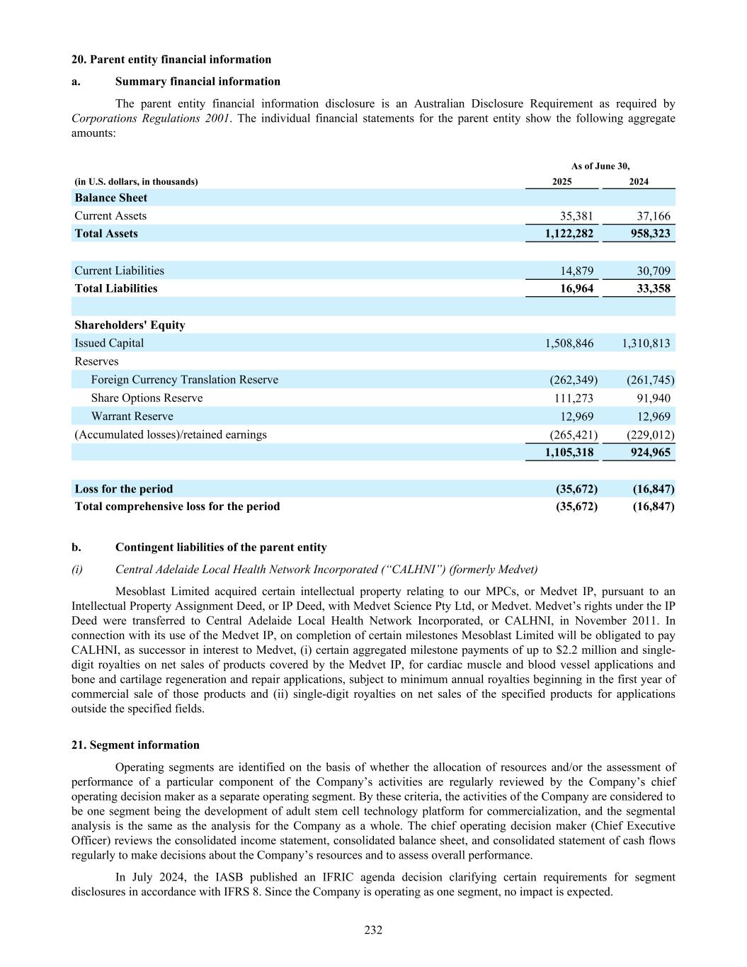 20. Parent entity financial information a. Summary financial information The parent entity financial information disclosure is an Australian Disclosure Requirement as required by Corporations Regulations 2001. The individual financial statements for the parent entity show the following aggregate amounts: As of June 30, (in U.S. dollars, in thousands) 2025 2024 Balance Sheet Current Assets 35,381 37,166 Total Assets 1,122,282 958,323 Current Liabilities 14,879 30,709 Total Liabilities 16,964 33,358 Shareholders' Equity Issued Capital 1,508,846 1,310,813 Reserves Foreign Currency Translation Reserve (262,349) (261,745) Share Options Reserve 111,273 91,940 Warrant Reserve 12,969 12,969 (Accumulated losses)/retained earnings (265,421) (229,012) 1,105,318 924,965 Loss for the period (35,672) (16,847) Total comprehensive loss for the period (35,672) (16,847) b. Contingent liabilities of the parent entity (i) Central Adelaide Local Health Network Incorporated (“CALHNI”) (formerly Medvet) Mesoblast Limited acquired certain intellectual property relating to our MPCs, or Medvet IP, pursuant to an Intellectual Property Assignment Deed, or IP Deed, with Medvet Science Pty Ltd, or Medvet. Medvet’s rights under the IP Deed were transferred to Central Adelaide Local Health Network Incorporated, or CALHNI, in November 2011. In connection with its use of the Medvet IP, on completion of certain milestones Mesoblast Limited will be obligated to pay CALHNI, as successor in interest to Medvet, (i) certain aggregated milestone payments of up to $2.2 million and single- digit royalties on net sales of products covered by the Medvet IP, for cardiac muscle and blood vessel applications and bone and cartilage regeneration and repair applications, subject to minimum annual royalties beginning in the first year of commercial sale of those products and (ii) single-digit royalties on net sales of the specified products for applications outside the specified fields. 21. Segment information Operating segments are identified on the basis of whether the allocation of resources and/or the assessment of performance of a particular component of the Company’s activities are regularly reviewed by the Company’s chief operating decision maker as a separate operating segment. By these criteria, the activities of the Company are considered to be one segment being the development of adult stem cell technology platform for commercialization, and the segmental analysis is the same as the analysis for the Company as a whole. The chief operating decision maker (Chief Executive Officer) reviews the consolidated income statement, consolidated balance sheet, and consolidated statement of cash flows regularly to make decisions about the Company’s resources and to assess overall performance. In July 2024, the IASB published an IFRIC agenda decision clarifying certain requirements for segment disclosures in accordance with IFRS 8. Since the Company is operating as one segment, no impact is expected. 232