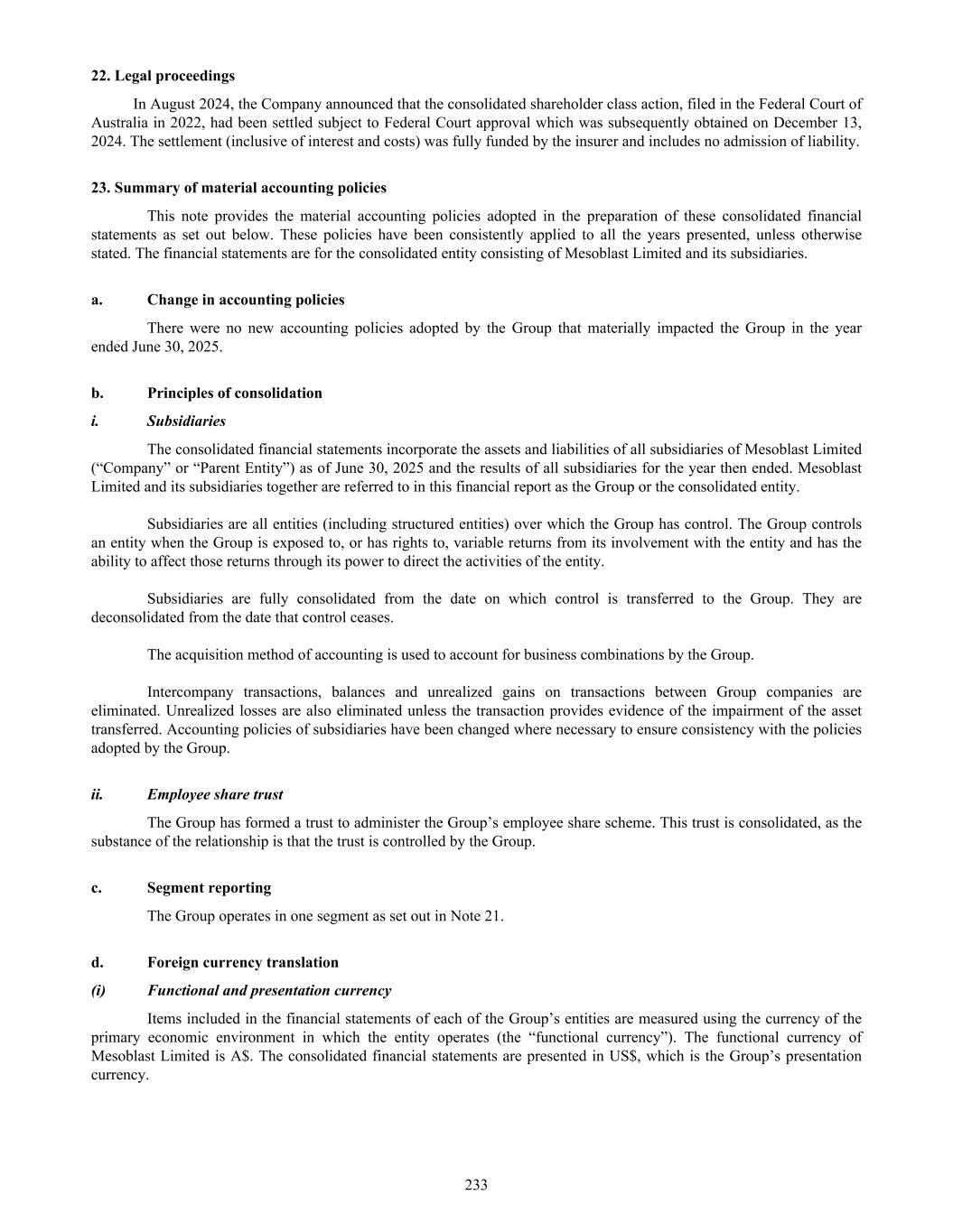 22. Legal proceedings In August 2024, the Company announced that the consolidated shareholder class action, filed in the Federal Court of Australia in 2022, had been settled subject to Federal Court approval which was subsequently obtained on December 13, 2024. The settlement (inclusive of interest and costs) was fully funded by the insurer and includes no admission of liability. 23. Summary of material accounting policies This note provides the material accounting policies adopted in the preparation of these consolidated financial statements as set out below. These policies have been consistently applied to all the years presented, unless otherwise stated. The financial statements are for the consolidated entity consisting of Mesoblast Limited and its subsidiaries. a. Change in accounting policies There were no new accounting policies adopted by the Group that materially impacted the Group in the year ended June 30, 2025. b. Principles of consolidation i. Subsidiaries The consolidated financial statements incorporate the assets and liabilities of all subsidiaries of Mesoblast Limited (“Company” or “Parent Entity”) as of June 30, 2025 and the results of all subsidiaries for the year then ended. Mesoblast Limited and its subsidiaries together are referred to in this financial report as the Group or the consolidated entity. Subsidiaries are all entities (including structured entities) over which the Group has control. The Group controls an entity when the Group is exposed to, or has rights to, variable returns from its involvement with the entity and has the ability to affect those returns through its power to direct the activities of the entity. Subsidiaries are fully consolidated from the date on which control is transferred to the Group. They are deconsolidated from the date that control ceases. The acquisition method of accounting is used to account for business combinations by the Group. Intercompany transactions, balances and unrealized gains on transactions between Group companies are eliminated. Unrealized losses are also eliminated unless the transaction provides evidence of the impairment of the asset transferred. Accounting policies of subsidiaries have been changed where necessary to ensure consistency with the policies adopted by the Group. ii. Employee share trust The Group has formed a trust to administer the Group’s employee share scheme. This trust is consolidated, as the substance of the relationship is that the trust is controlled by the Group. c. Segment reporting The Group operates in one segment as set out in Note 21. d. Foreign currency translation (i) Functional and presentation currency Items included in the financial statements of each of the Group’s entities are measured using the currency of the primary economic environment in which the entity operates (the “functional currency”). The functional currency of Mesoblast Limited is A$. The consolidated financial statements are presented in US$, which is the Group’s presentation currency. 233
