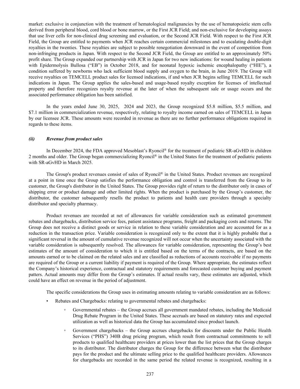 market: exclusive in conjunction with the treatment of hematological malignancies by the use of hematopoietic stem cells derived from peripheral blood, cord blood or bone marrow, or the First JCR Field; and non-exclusive for developing assays that use liver cells for non-clinical drug screening and evaluation, or the Second JCR Field. With respect to the First JCR Field, the Group are entitled to payments when JCR reaches certain commercial milestones and to escalating double-digit royalties in the twenties. These royalties are subject to possible renegotiation downward in the event of competition from non-infringing products in Japan. With respect to the Second JCR Field, the Group are entitled to an approximately 50% profit share. The Group expanded our partnership with JCR in Japan for two new indications: for wound healing in patients with Epidermolysis Bullosa (“EB”) in October 2018, and for neonatal hypoxic ischemic encephalopathy (“HIE”), a condition suffered by newborns who lack sufficient blood supply and oxygen to the brain, in June 2019. The Group will receive royalties on TEMCELL product sales for licensed indications, if and when JCR begins selling TEMCELL for such indications in Japan. The Group applies the sales-based and usage-based royalty exception for licenses of intellectual property and therefore recognizes royalty revenue at the later of when the subsequent sale or usage occurs and the associated performance obligation has been satisfied. In the years ended June 30, 2025, 2024 and 2023, the Group recognized $5.8 million, $5.5 million, and $7.1 million in commercialization revenue, respectively, relating to royalty income earned on sales of TEMCELL in Japan by our licensee JCR. These amounts were recorded in revenue as there are no further performance obligations required in regards to these items. (ii) Revenue from product sales In December 2024, the FDA approved Mesoblast’s Ryoncil® for the treatment of pediatric SR-aGvHD in children 2 months and older. The Group began commercializing Ryoncil® in the United States for the treatment of pediatric patients with SR-aGvHD in March 2025. The Group's product revenues consist of sales of Ryoncil® in the United States. Product revenues are recognized at a point in time once the Group satisfies the performance obligation and control is transferred from the Group to its customer, the Group's distributor in the United States. The Group provides right of return to the distributor only in cases of shipping error or product damage and other limited rights. When the product is purchased by the Group’s customer, the distributor, the customer subsequently resells the product to patients and health care providers through a specialty distributor and specialty pharmacy. Product revenues are recorded at net of allowances for variable consideration such as estimated government rebates and chargebacks, distribution service fees, patient assistance programs, freight and packaging costs and returns. The Group does not receive a distinct goods or service in relation to these variable consideration and are accounted for as a reduction in the transaction price. Variable consideration is recognized only to the extent that it is highly probable that a significant reversal in the amount of cumulative revenue recognized will not occur when the uncertainty associated with the variable consideration is subsequently resolved. The allowances for variable consideration, representing the Group’s best estimates of the amount of consideration to which it is entitled based on the terms of the contracts, are based on the amounts earned or to be claimed on the related sales and are classified as reductions of accounts receivable if no payments are required of the Group or a current liability if payment is required of the Group. Where appropriate, the estimates reflect the Company’s historical experience, contractual and statutory requirements and forecasted customer buying and payment patters. Actual amounts may differ from the Group’s estimates. If actual results vary, these estimates are adjusted, which could have an effect on revenue in the period of adjustment. The specific considerations the Group uses in estimating amounts relating to variable consideration are as follows: • Rebates and Chargebacks: relating to governmental rebates and chargebacks: ◦ Governmental rebates – the Group accrues all government mandated rebates, including the Medicaid Drug Rebate Program in the United States. These accruals are based on statutory rates and expected utilization as well as historical data the Group has accumulated since product launch. ◦ Government chargebacks – the Group accrues chargebacks for discounts under the Public Health Services (“PHS”) 340B drug pricing program, which result from contractual commitments to sell products to qualified healthcare providers at prices lower than the list prices that the Group charges to its distributor. The distributor charges the Group for the difference between what the distributor pays for the product and the ultimate selling price to the qualified healthcare providers. Allowances for chargebacks are recorded in the same period the related revenue is recognized, resulting in a 237