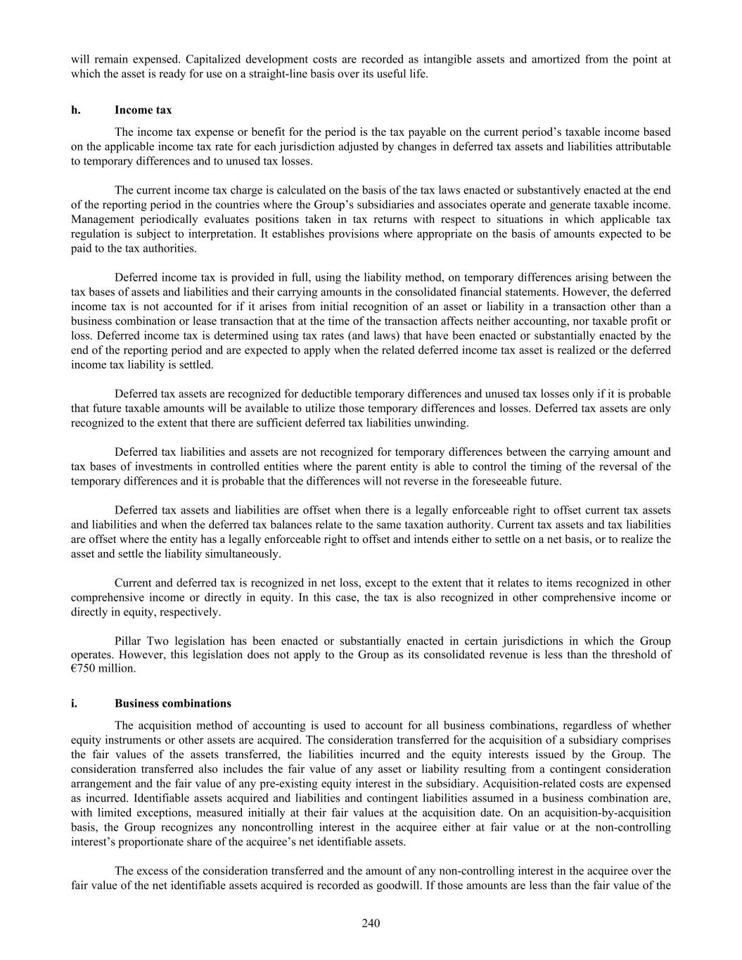 will remain expensed. Capitalized development costs are recorded as intangible assets and amortized from the point at which the asset is ready for use on a straight-line basis over its useful life. h. Income tax The income tax expense or benefit for the period is the tax payable on the current period’s taxable income based on the applicable income tax rate for each jurisdiction adjusted by changes in deferred tax assets and liabilities attributable to temporary differences and to unused tax losses. The current income tax charge is calculated on the basis of the tax laws enacted or substantively enacted at the end of the reporting period in the countries where the Group’s subsidiaries and associates operate and generate taxable income. Management periodically evaluates positions taken in tax returns with respect to situations in which applicable tax regulation is subject to interpretation. It establishes provisions where appropriate on the basis of amounts expected to be paid to the tax authorities. Deferred income tax is provided in full, using the liability method, on temporary differences arising between the tax bases of assets and liabilities and their carrying amounts in the consolidated financial statements. However, the deferred income tax is not accounted for if it arises from initial recognition of an asset or liability in a transaction other than a business combination or lease transaction that at the time of the transaction affects neither accounting, nor taxable profit or loss. Deferred income tax is determined using tax rates (and laws) that have been enacted or substantially enacted by the end of the reporting period and are expected to apply when the related deferred income tax asset is realized or the deferred income tax liability is settled. Deferred tax assets are recognized for deductible temporary differences and unused tax losses only if it is probable that future taxable amounts will be available to utilize those temporary differences and losses. Deferred tax assets are only recognized to the extent that there are sufficient deferred tax liabilities unwinding. Deferred tax liabilities and assets are not recognized for temporary differences between the carrying amount and tax bases of investments in controlled entities where the parent entity is able to control the timing of the reversal of the temporary differences and it is probable that the differences will not reverse in the foreseeable future. Deferred tax assets and liabilities are offset when there is a legally enforceable right to offset current tax assets and liabilities and when the deferred tax balances relate to the same taxation authority. Current tax assets and tax liabilities are offset where the entity has a legally enforceable right to offset and intends either to settle on a net basis, or to realize the asset and settle the liability simultaneously. Current and deferred tax is recognized in net loss, except to the extent that it relates to items recognized in other comprehensive income or directly in equity. In this case, the tax is also recognized in other comprehensive income or directly in equity, respectively. Pillar Two legislation has been enacted or substantially enacted in certain jurisdictions in which the Group operates. However, this legislation does not apply to the Group as its consolidated revenue is less than the threshold of €750 million. i. Business combinations The acquisition method of accounting is used to account for all business combinations, regardless of whether equity instruments or other assets are acquired. The consideration transferred for the acquisition of a subsidiary comprises the fair values of the assets transferred, the liabilities incurred and the equity interests issued by the Group. The consideration transferred also includes the fair value of any asset or liability resulting from a contingent consideration arrangement and the fair value of any pre-existing equity interest in the subsidiary. Acquisition-related costs are expensed as incurred. Identifiable assets acquired and liabilities and contingent liabilities assumed in a business combination are, with limited exceptions, measured initially at their fair values at the acquisition date. On an acquisition-by-acquisition basis, the Group recognizes any noncontrolling interest in the acquiree either at fair value or at the non-controlling interest’s proportionate share of the acquiree’s net identifiable assets. The excess of the consideration transferred and the amount of any non-controlling interest in the acquiree over the fair value of the net identifiable assets acquired is recorded as goodwill. If those amounts are less than the fair value of the 240