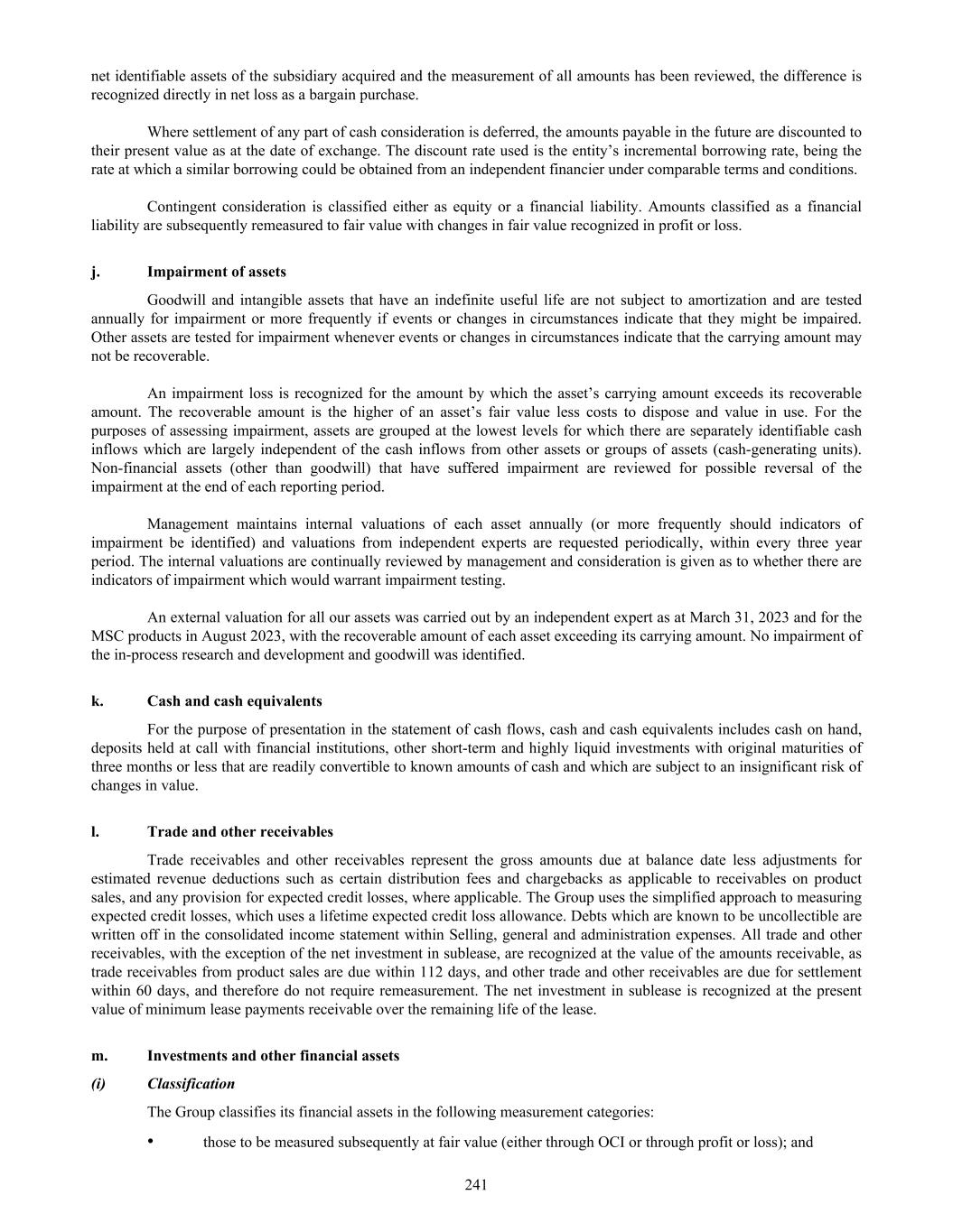 net identifiable assets of the subsidiary acquired and the measurement of all amounts has been reviewed, the difference is recognized directly in net loss as a bargain purchase. Where settlement of any part of cash consideration is deferred, the amounts payable in the future are discounted to their present value as at the date of exchange. The discount rate used is the entity’s incremental borrowing rate, being the rate at which a similar borrowing could be obtained from an independent financier under comparable terms and conditions. Contingent consideration is classified either as equity or a financial liability. Amounts classified as a financial liability are subsequently remeasured to fair value with changes in fair value recognized in profit or loss. j. Impairment of assets Goodwill and intangible assets that have an indefinite useful life are not subject to amortization and are tested annually for impairment or more frequently if events or changes in circumstances indicate that they might be impaired. Other assets are tested for impairment whenever events or changes in circumstances indicate that the carrying amount may not be recoverable. An impairment loss is recognized for the amount by which the asset’s carrying amount exceeds its recoverable amount. The recoverable amount is the higher of an asset’s fair value less costs to dispose and value in use. For the purposes of assessing impairment, assets are grouped at the lowest levels for which there are separately identifiable cash inflows which are largely independent of the cash inflows from other assets or groups of assets (cash-generating units). Non-financial assets (other than goodwill) that have suffered impairment are reviewed for possible reversal of the impairment at the end of each reporting period. Management maintains internal valuations of each asset annually (or more frequently should indicators of impairment be identified) and valuations from independent experts are requested periodically, within every three year period. The internal valuations are continually reviewed by management and consideration is given as to whether there are indicators of impairment which would warrant impairment testing. An external valuation for all our assets was carried out by an independent expert as at March 31, 2023 and for the MSC products in August 2023, with the recoverable amount of each asset exceeding its carrying amount. No impairment of the in-process research and development and goodwill was identified. k. Cash and cash equivalents For the purpose of presentation in the statement of cash flows, cash and cash equivalents includes cash on hand, deposits held at call with financial institutions, other short-term and highly liquid investments with original maturities of three months or less that are readily convertible to known amounts of cash and which are subject to an insignificant risk of changes in value. l. Trade and other receivables Trade receivables and other receivables represent the gross amounts due at balance date less adjustments for estimated revenue deductions such as certain distribution fees and chargebacks as applicable to receivables on product sales, and any provision for expected credit losses, where applicable. The Group uses the simplified approach to measuring expected credit losses, which uses a lifetime expected credit loss allowance. Debts which are known to be uncollectible are written off in the consolidated income statement within Selling, general and administration expenses. All trade and other receivables, with the exception of the net investment in sublease, are recognized at the value of the amounts receivable, as trade receivables from product sales are due within 112 days, and other trade and other receivables are due for settlement within 60 days, and therefore do not require remeasurement. The net investment in sublease is recognized at the present value of minimum lease payments receivable over the remaining life of the lease. m. Investments and other financial assets (i) Classification The Group classifies its financial assets in the following measurement categories: • those to be measured subsequently at fair value (either through OCI or through profit or loss); and 241