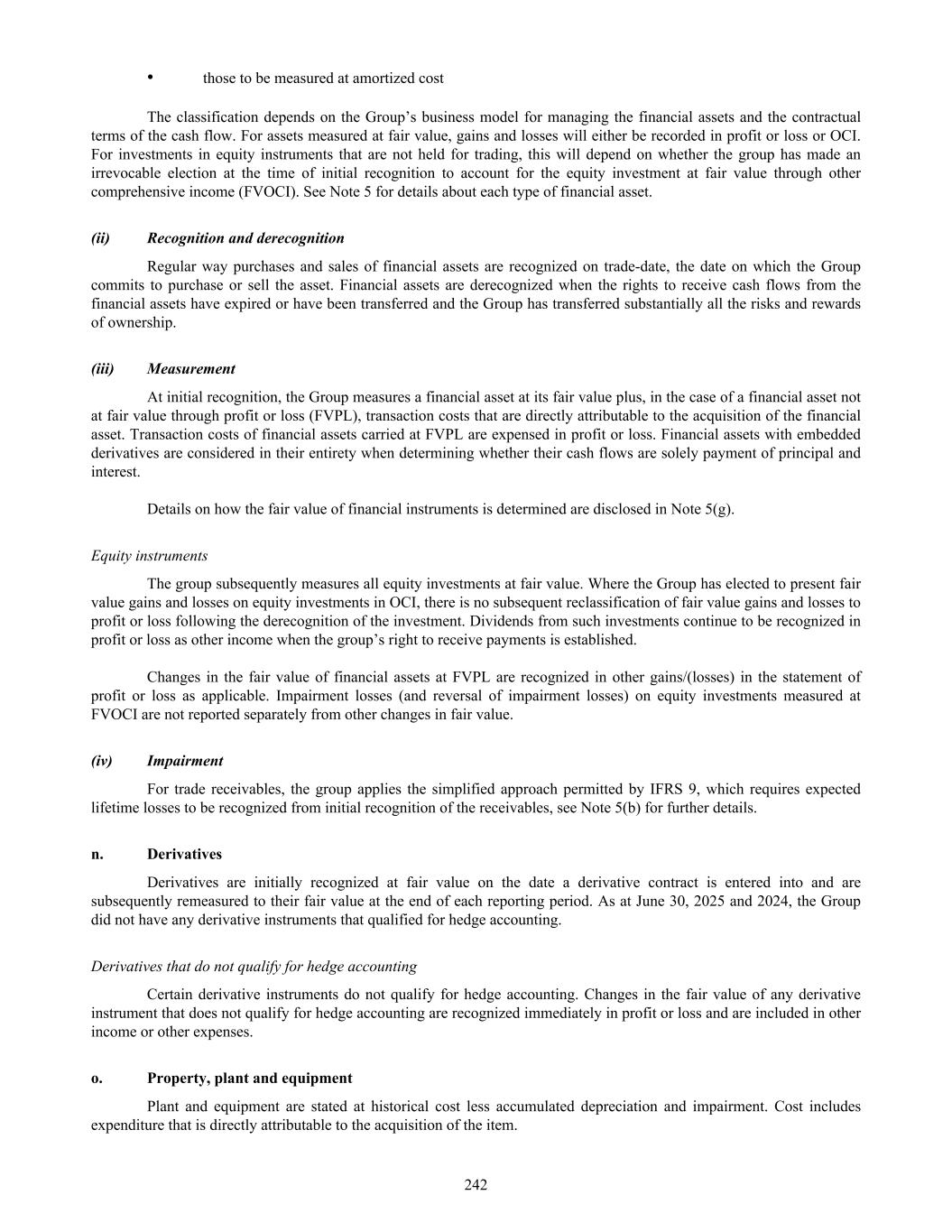 • those to be measured at amortized cost The classification depends on the Group’s business model for managing the financial assets and the contractual terms of the cash flow. For assets measured at fair value, gains and losses will either be recorded in profit or loss or OCI. For investments in equity instruments that are not held for trading, this will depend on whether the group has made an irrevocable election at the time of initial recognition to account for the equity investment at fair value through other comprehensive income (FVOCI). See Note 5 for details about each type of financial asset. (ii) Recognition and derecognition Regular way purchases and sales of financial assets are recognized on trade-date, the date on which the Group commits to purchase or sell the asset. Financial assets are derecognized when the rights to receive cash flows from the financial assets have expired or have been transferred and the Group has transferred substantially all the risks and rewards of ownership. (iii) Measurement At initial recognition, the Group measures a financial asset at its fair value plus, in the case of a financial asset not at fair value through profit or loss (FVPL), transaction costs that are directly attributable to the acquisition of the financial asset. Transaction costs of financial assets carried at FVPL are expensed in profit or loss. Financial assets with embedded derivatives are considered in their entirety when determining whether their cash flows are solely payment of principal and interest. Details on how the fair value of financial instruments is determined are disclosed in Note 5(g). Equity instruments The group subsequently measures all equity investments at fair value. Where the Group has elected to present fair value gains and losses on equity investments in OCI, there is no subsequent reclassification of fair value gains and losses to profit or loss following the derecognition of the investment. Dividends from such investments continue to be recognized in profit or loss as other income when the group’s right to receive payments is established. Changes in the fair value of financial assets at FVPL are recognized in other gains/(losses) in the statement of profit or loss as applicable. Impairment losses (and reversal of impairment losses) on equity investments measured at FVOCI are not reported separately from other changes in fair value. (iv) Impairment For trade receivables, the group applies the simplified approach permitted by IFRS 9, which requires expected lifetime losses to be recognized from initial recognition of the receivables, see Note 5(b) for further details. n. Derivatives Derivatives are initially recognized at fair value on the date a derivative contract is entered into and are subsequently remeasured to their fair value at the end of each reporting period. As at June 30, 2025 and 2024, the Group did not have any derivative instruments that qualified for hedge accounting. Derivatives that do not qualify for hedge accounting Certain derivative instruments do not qualify for hedge accounting. Changes in the fair value of any derivative instrument that does not qualify for hedge accounting are recognized immediately in profit or loss and are included in other income or other expenses. o. Property, plant and equipment Plant and equipment are stated at historical cost less accumulated depreciation and impairment. Cost includes expenditure that is directly attributable to the acquisition of the item. 242