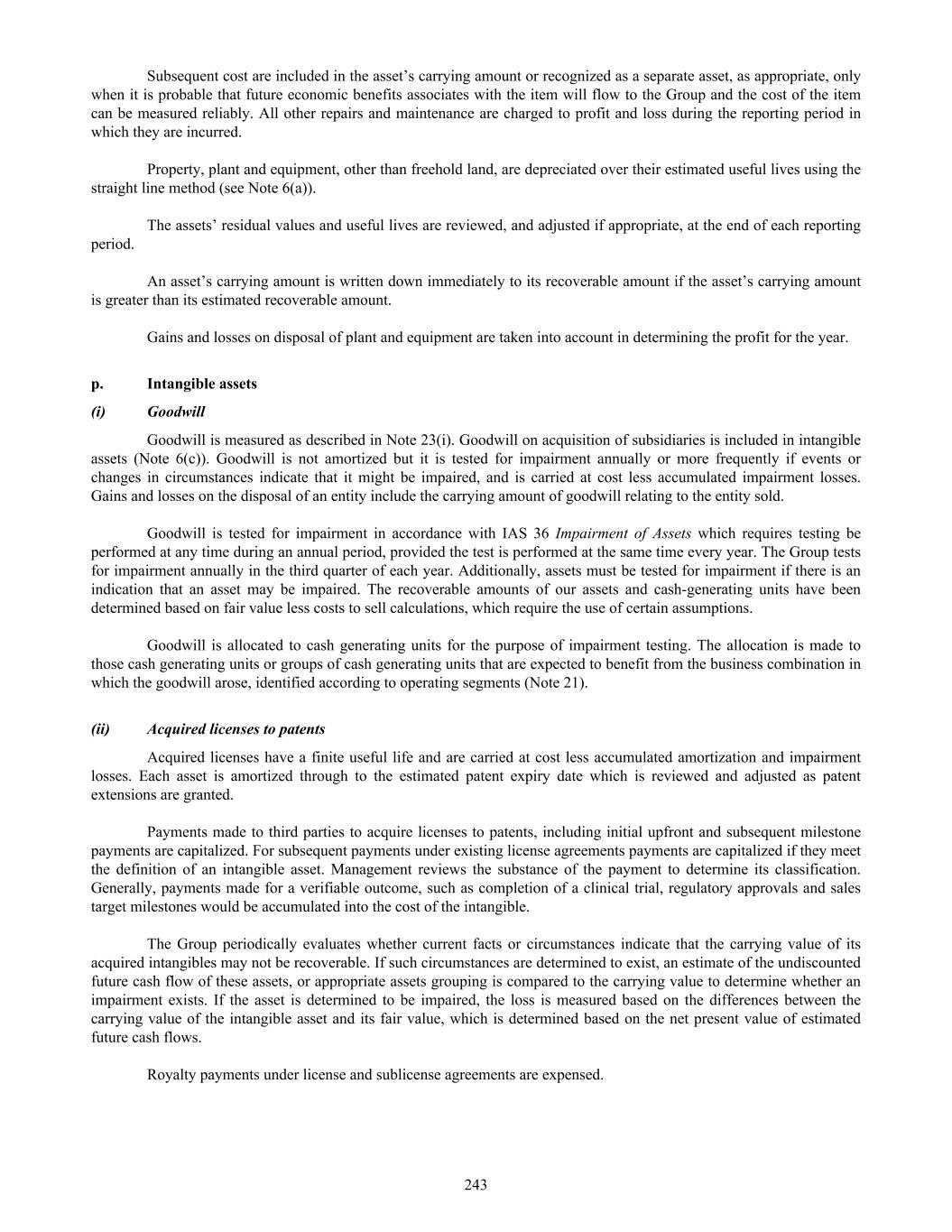 Subsequent cost are included in the asset’s carrying amount or recognized as a separate asset, as appropriate, only when it is probable that future economic benefits associates with the item will flow to the Group and the cost of the item can be measured reliably. All other repairs and maintenance are charged to profit and loss during the reporting period in which they are incurred. Property, plant and equipment, other than freehold land, are depreciated over their estimated useful lives using the straight line method (see Note 6(a)). The assets’ residual values and useful lives are reviewed, and adjusted if appropriate, at the end of each reporting period. An asset’s carrying amount is written down immediately to its recoverable amount if the asset’s carrying amount is greater than its estimated recoverable amount. Gains and losses on disposal of plant and equipment are taken into account in determining the profit for the year. p. Intangible assets (i) Goodwill Goodwill is measured as described in Note 23(i). Goodwill on acquisition of subsidiaries is included in intangible assets (Note 6(c)). Goodwill is not amortized but it is tested for impairment annually or more frequently if events or changes in circumstances indicate that it might be impaired, and is carried at cost less accumulated impairment losses. Gains and losses on the disposal of an entity include the carrying amount of goodwill relating to the entity sold. Goodwill is tested for impairment in accordance with IAS 36 Impairment of Assets which requires testing be performed at any time during an annual period, provided the test is performed at the same time every year. The Group tests for impairment annually in the third quarter of each year. Additionally, assets must be tested for impairment if there is an indication that an asset may be impaired. The recoverable amounts of our assets and cash-generating units have been determined based on fair value less costs to sell calculations, which require the use of certain assumptions. Goodwill is allocated to cash generating units for the purpose of impairment testing. The allocation is made to those cash generating units or groups of cash generating units that are expected to benefit from the business combination in which the goodwill arose, identified according to operating segments (Note 21). (ii) Acquired licenses to patents Acquired licenses have a finite useful life and are carried at cost less accumulated amortization and impairment losses. Each asset is amortized through to the estimated patent expiry date which is reviewed and adjusted as patent extensions are granted. Payments made to third parties to acquire licenses to patents, including initial upfront and subsequent milestone payments are capitalized. For subsequent payments under existing license agreements payments are capitalized if they meet the definition of an intangible asset. Management reviews the substance of the payment to determine its classification. Generally, payments made for a verifiable outcome, such as completion of a clinical trial, regulatory approvals and sales target milestones would be accumulated into the cost of the intangible. The Group periodically evaluates whether current facts or circumstances indicate that the carrying value of its acquired intangibles may not be recoverable. If such circumstances are determined to exist, an estimate of the undiscounted future cash flow of these assets, or appropriate assets grouping is compared to the carrying value to determine whether an impairment exists. If the asset is determined to be impaired, the loss is measured based on the differences between the carrying value of the intangible asset and its fair value, which is determined based on the net present value of estimated future cash flows. Royalty payments under license and sublicense agreements are expensed. 243