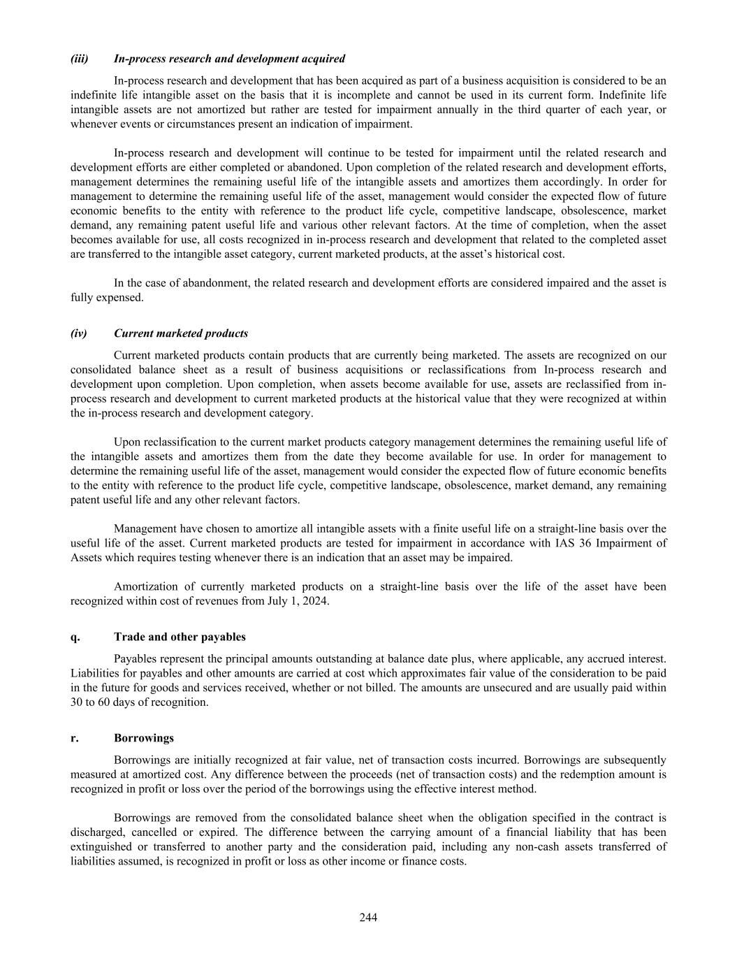 (iii) In-process research and development acquired In-process research and development that has been acquired as part of a business acquisition is considered to be an indefinite life intangible asset on the basis that it is incomplete and cannot be used in its current form. Indefinite life intangible assets are not amortized but rather are tested for impairment annually in the third quarter of each year, or whenever events or circumstances present an indication of impairment. In-process research and development will continue to be tested for impairment until the related research and development efforts are either completed or abandoned. Upon completion of the related research and development efforts, management determines the remaining useful life of the intangible assets and amortizes them accordingly. In order for management to determine the remaining useful life of the asset, management would consider the expected flow of future economic benefits to the entity with reference to the product life cycle, competitive landscape, obsolescence, market demand, any remaining patent useful life and various other relevant factors. At the time of completion, when the asset becomes available for use, all costs recognized in in-process research and development that related to the completed asset are transferred to the intangible asset category, current marketed products, at the asset’s historical cost. In the case of abandonment, the related research and development efforts are considered impaired and the asset is fully expensed. (iv) Current marketed products Current marketed products contain products that are currently being marketed. The assets are recognized on our consolidated balance sheet as a result of business acquisitions or reclassifications from In-process research and development upon completion. Upon completion, when assets become available for use, assets are reclassified from in- process research and development to current marketed products at the historical value that they were recognized at within the in-process research and development category. Upon reclassification to the current market products category management determines the remaining useful life of the intangible assets and amortizes them from the date they become available for use. In order for management to determine the remaining useful life of the asset, management would consider the expected flow of future economic benefits to the entity with reference to the product life cycle, competitive landscape, obsolescence, market demand, any remaining patent useful life and any other relevant factors. Management have chosen to amortize all intangible assets with a finite useful life on a straight-line basis over the useful life of the asset. Current marketed products are tested for impairment in accordance with IAS 36 Impairment of Assets which requires testing whenever there is an indication that an asset may be impaired. Amortization of currently marketed products on a straight-line basis over the life of the asset have been recognized within cost of revenues from July 1, 2024. q. Trade and other payables Payables represent the principal amounts outstanding at balance date plus, where applicable, any accrued interest. Liabilities for payables and other amounts are carried at cost which approximates fair value of the consideration to be paid in the future for goods and services received, whether or not billed. The amounts are unsecured and are usually paid within 30 to 60 days of recognition. r. Borrowings Borrowings are initially recognized at fair value, net of transaction costs incurred. Borrowings are subsequently measured at amortized cost. Any difference between the proceeds (net of transaction costs) and the redemption amount is recognized in profit or loss over the period of the borrowings using the effective interest method. Borrowings are removed from the consolidated balance sheet when the obligation specified in the contract is discharged, cancelled or expired. The difference between the carrying amount of a financial liability that has been extinguished or transferred to another party and the consideration paid, including any non-cash assets transferred of liabilities assumed, is recognized in profit or loss as other income or finance costs. 244