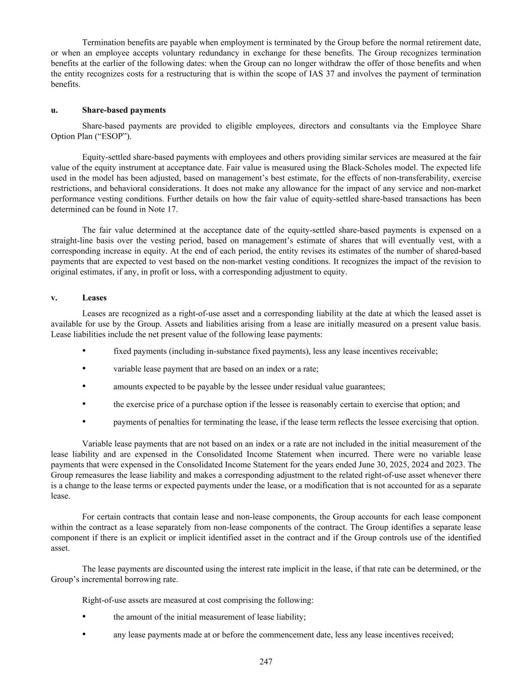 Termination benefits are payable when employment is terminated by the Group before the normal retirement date, or when an employee accepts voluntary redundancy in exchange for these benefits. The Group recognizes termination benefits at the earlier of the following dates: when the Group can no longer withdraw the offer of those benefits and when the entity recognizes costs for a restructuring that is within the scope of IAS 37 and involves the payment of termination benefits. u. Share-based payments Share-based payments are provided to eligible employees, directors and consultants via the Employee Share Option Plan (“ESOP”). Equity-settled share-based payments with employees and others providing similar services are measured at the fair value of the equity instrument at acceptance date. Fair value is measured using the Black-Scholes model. The expected life used in the model has been adjusted, based on management’s best estimate, for the effects of non-transferability, exercise restrictions, and behavioral considerations. It does not make any allowance for the impact of any service and non-market performance vesting conditions. Further details on how the fair value of equity-settled share-based transactions has been determined can be found in Note 17. The fair value determined at the acceptance date of the equity-settled share-based payments is expensed on a straight-line basis over the vesting period, based on management’s estimate of shares that will eventually vest, with a corresponding increase in equity. At the end of each period, the entity revises its estimates of the number of shared-based payments that are expected to vest based on the non-market vesting conditions. It recognizes the impact of the revision to original estimates, if any, in profit or loss, with a corresponding adjustment to equity. v. Leases Leases are recognized as a right-of-use asset and a corresponding liability at the date at which the leased asset is available for use by the Group. Assets and liabilities arising from a lease are initially measured on a present value basis. Lease liabilities include the net present value of the following lease payments: • fixed payments (including in-substance fixed payments), less any lease incentives receivable; • variable lease payment that are based on an index or a rate; • amounts expected to be payable by the lessee under residual value guarantees; • the exercise price of a purchase option if the lessee is reasonably certain to exercise that option; and • payments of penalties for terminating the lease, if the lease term reflects the lessee exercising that option. Variable lease payments that are not based on an index or a rate are not included in the initial measurement of the lease liability and are expensed in the Consolidated Income Statement when incurred. There were no variable lease payments that were expensed in the Consolidated Income Statement for the years ended June 30, 2025, 2024 and 2023. The Group remeasures the lease liability and makes a corresponding adjustment to the related right-of-use asset whenever there is a change to the lease terms or expected payments under the lease, or a modification that is not accounted for as a separate lease. For certain contracts that contain lease and non-lease components, the Group accounts for each lease component within the contract as a lease separately from non-lease components of the contract. The Group identifies a separate lease component if there is an explicit or implicit identified asset in the contract and if the Group controls use of the identified asset. The lease payments are discounted using the interest rate implicit in the lease, if that rate can be determined, or the Group’s incremental borrowing rate. Right-of-use assets are measured at cost comprising the following: • the amount of the initial measurement of lease liability; • any lease payments made at or before the commencement date, less any lease incentives received; 247