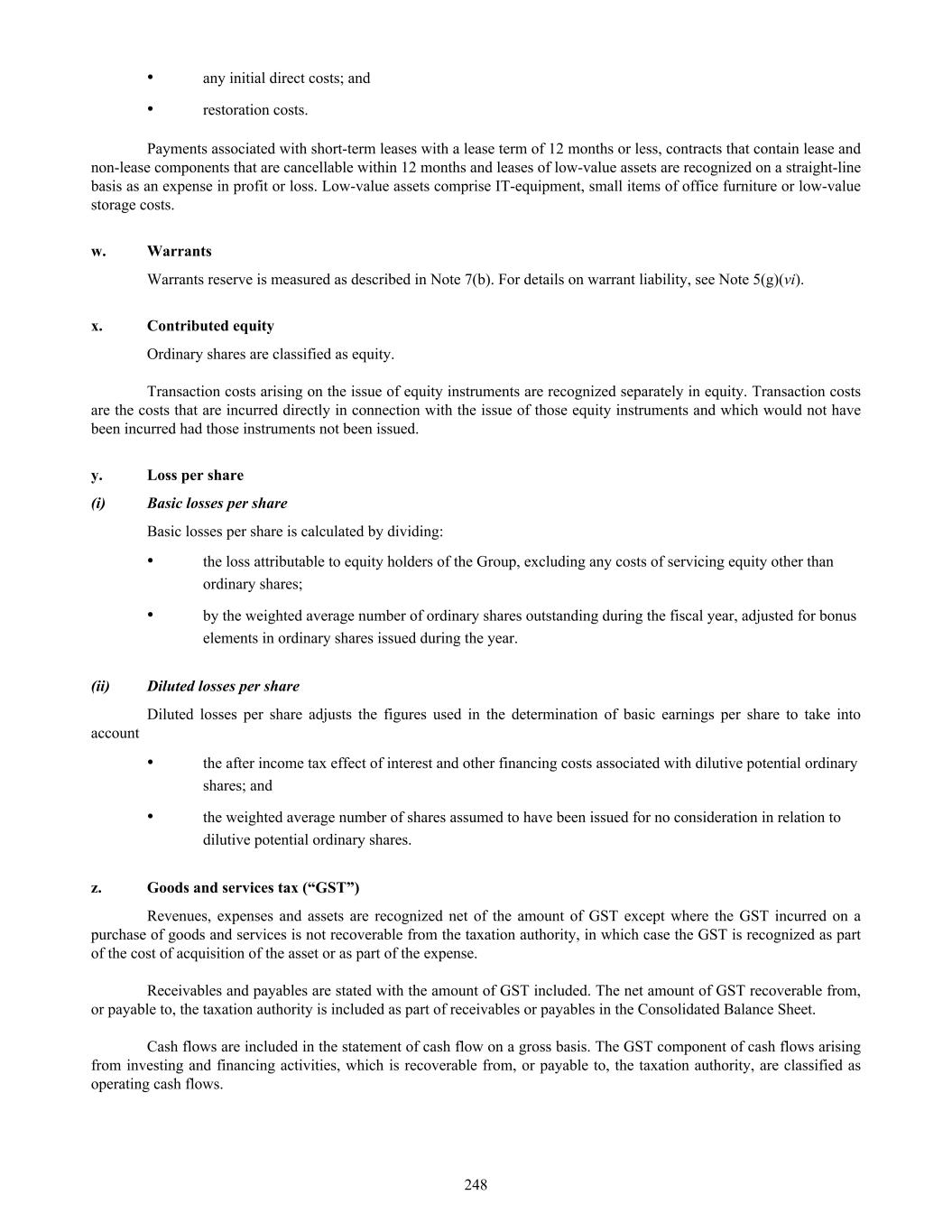 • any initial direct costs; and • restoration costs. Payments associated with short-term leases with a lease term of 12 months or less, contracts that contain lease and non-lease components that are cancellable within 12 months and leases of low-value assets are recognized on a straight-line basis as an expense in profit or loss. Low-value assets comprise IT-equipment, small items of office furniture or low-value storage costs. w. Warrants Warrants reserve is measured as described in Note 7(b). For details on warrant liability, see Note 5(g)(vi). x. Contributed equity Ordinary shares are classified as equity. Transaction costs arising on the issue of equity instruments are recognized separately in equity. Transaction costs are the costs that are incurred directly in connection with the issue of those equity instruments and which would not have been incurred had those instruments not been issued. y. Loss per share (i) Basic losses per share Basic losses per share is calculated by dividing: • the loss attributable to equity holders of the Group, excluding any costs of servicing equity other than ordinary shares; • by the weighted average number of ordinary shares outstanding during the fiscal year, adjusted for bonus elements in ordinary shares issued during the year. (ii) Diluted losses per share Diluted losses per share adjusts the figures used in the determination of basic earnings per share to take into account • the after income tax effect of interest and other financing costs associated with dilutive potential ordinary shares; and • the weighted average number of shares assumed to have been issued for no consideration in relation to dilutive potential ordinary shares. z. Goods and services tax (“GST”) Revenues, expenses and assets are recognized net of the amount of GST except where the GST incurred on a purchase of goods and services is not recoverable from the taxation authority, in which case the GST is recognized as part of the cost of acquisition of the asset or as part of the expense. Receivables and payables are stated with the amount of GST included. The net amount of GST recoverable from, or payable to, the taxation authority is included as part of receivables or payables in the Consolidated Balance Sheet. Cash flows are included in the statement of cash flow on a gross basis. The GST component of cash flows arising from investing and financing activities, which is recoverable from, or payable to, the taxation authority, are classified as operating cash flows. 248