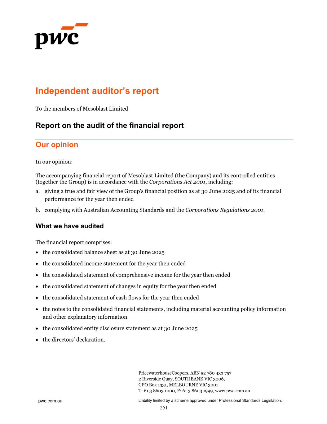 pwc.com.au PricewaterhouseCoopers, ABN 52 780 433 757 2 Riverside Quay, SOUTHBANK VIC 3006, GPO Box 1331, MELBOURNE VIC 3001 T: 61 3 8603 1000, F: 61 3 8603 1999, www.pwc.com.au Liability limited by a scheme approved under Professional Standards Legislation. Independent auditor’s report To the members of Mesoblast Limited Report on the audit of the financial report Our opinion In our opinion: The accompanying financial report of Mesoblast Limited (the Company) and its controlled entities (together the Group) is in accordance with the Corporations Act 2001, including: a. giving a true and fair view of the Group's financial position as at 30 June 2025 and of its financial performance for the year then ended b. complying with Australian Accounting Standards and the Corporations Regulations 2001. What we have audited The financial report comprises: the consolidated balance sheet as at 30 June 2025 the consolidated income statement for the year then ended the consolidated statement of comprehensive income for the year then ended the consolidated statement of changes in equity for the year then ended the consolidated statement of cash flows for the year then ended the notes to the consolidated financial statements, including material accounting policy information and other explanatory information the consolidated entity disclosure statement as at 30 June 2025 the directors’ declaration. 251